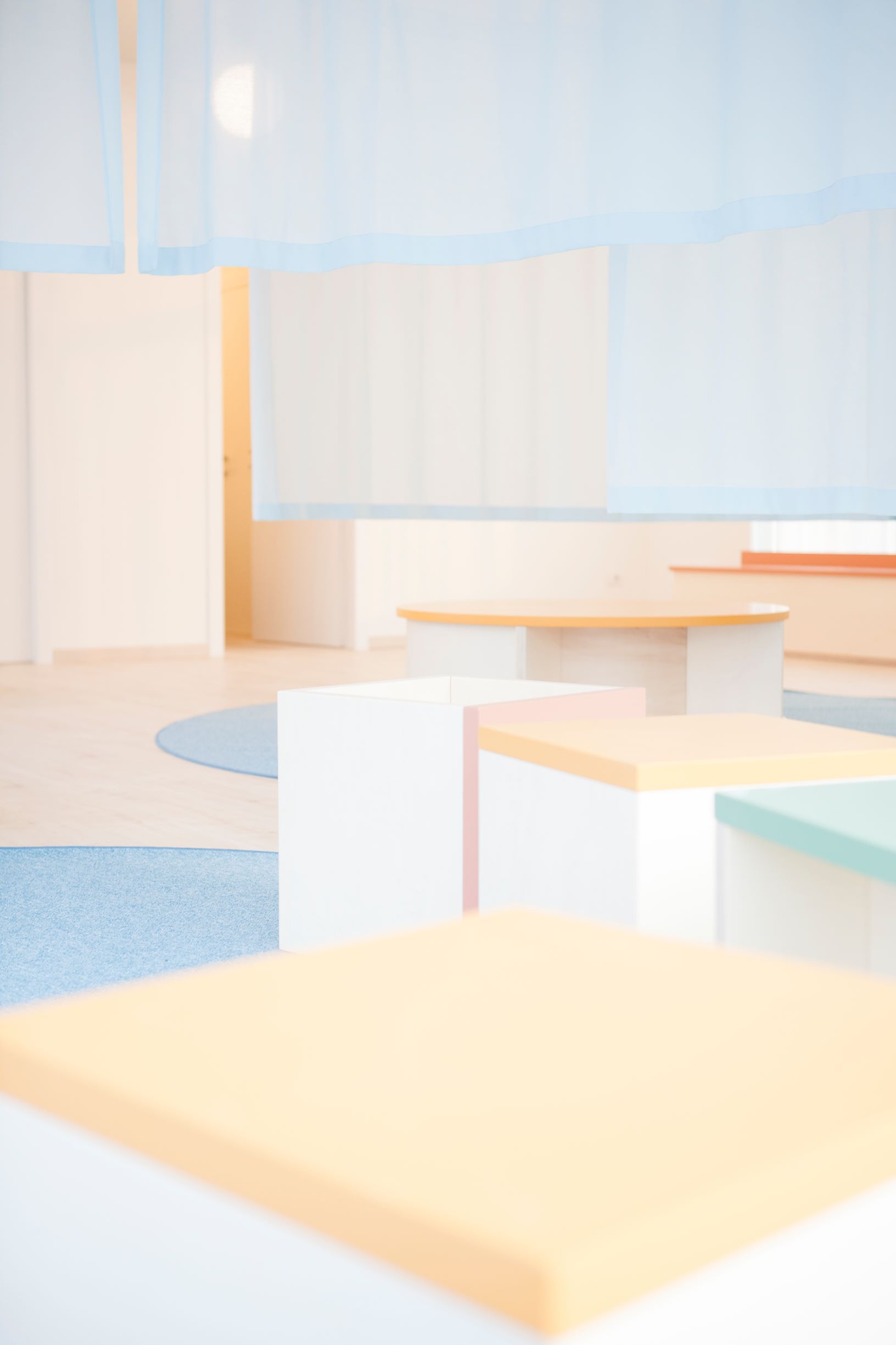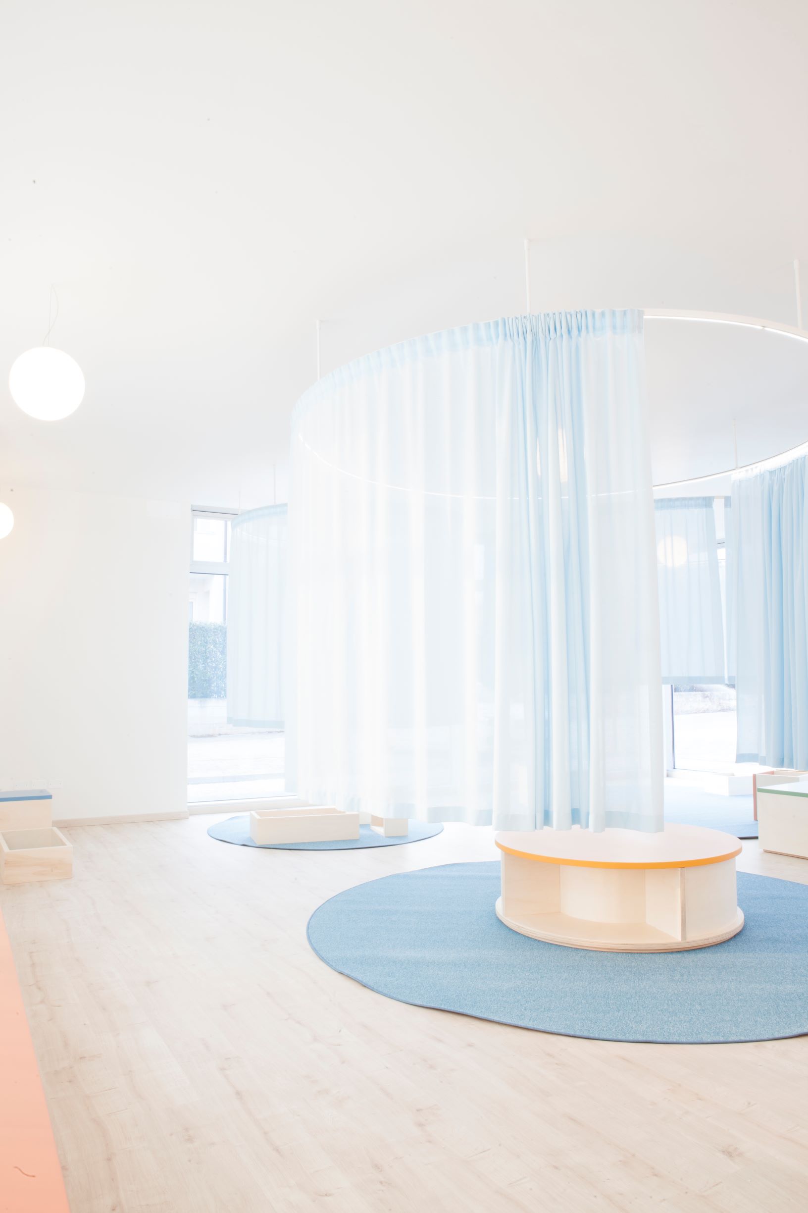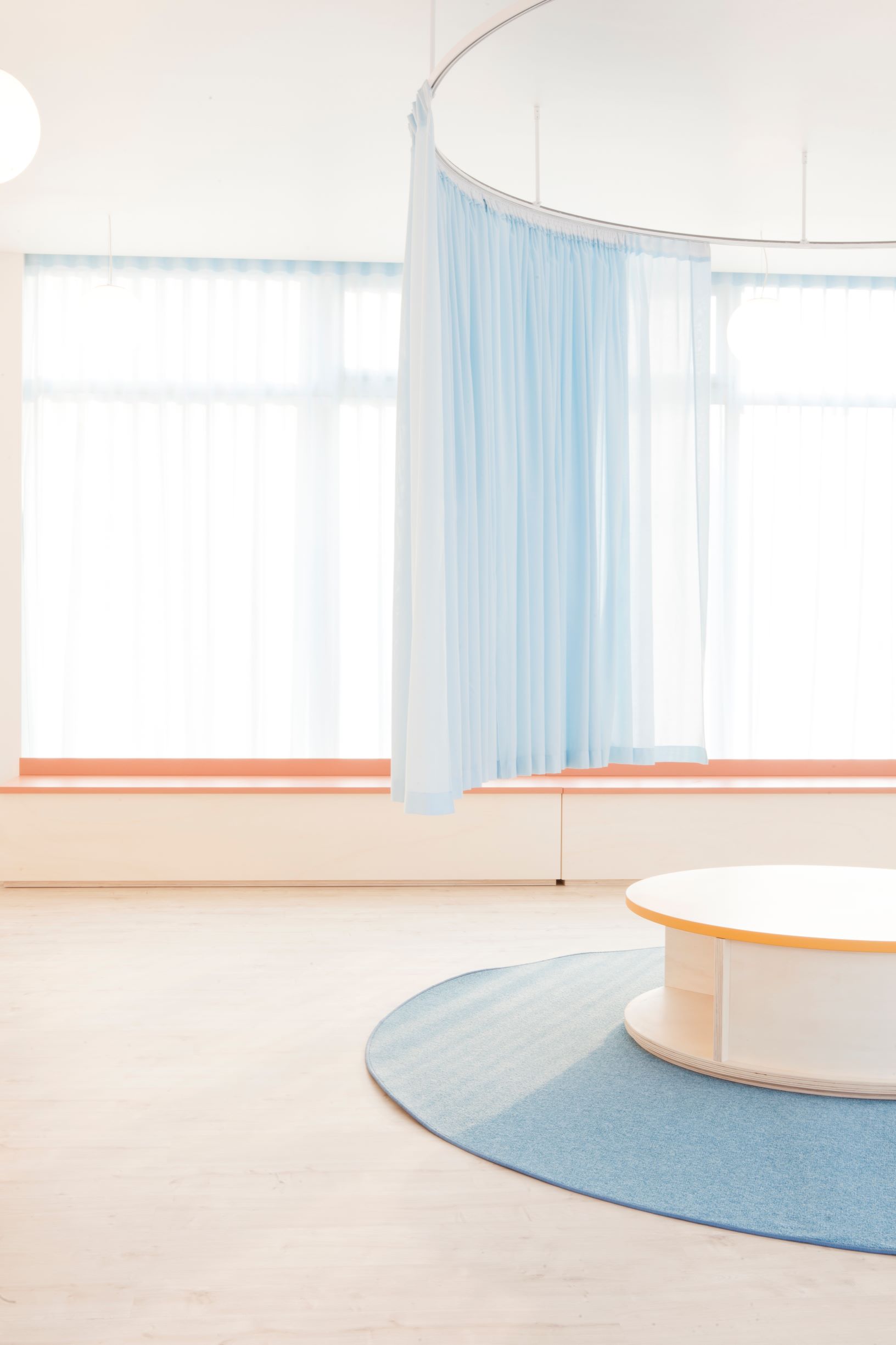 놀이성과 투명성은 어린이 전용 치과 프로젝트의 기초에 있는 주제이다. 원형 난간에 드리워진 커튼의 사용으로 인해 주요 공간 내에 3개의 뚜렷한 영역이 형성된다. 이러한 공간의 한계를 강화하기 위해, 지상의 커튼 둘레를 다시 찾는 주문 제작 카펫이 있습니다. 이런 방 안에서 느끼는 감정은 보호와 친밀감이지만 외부에서는 시야가 확보돼 부모가 자녀들을 놀면서 보는 시야가 확보된다.