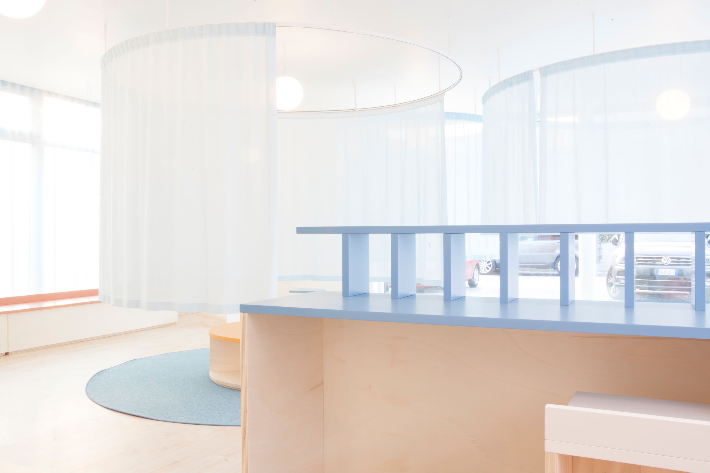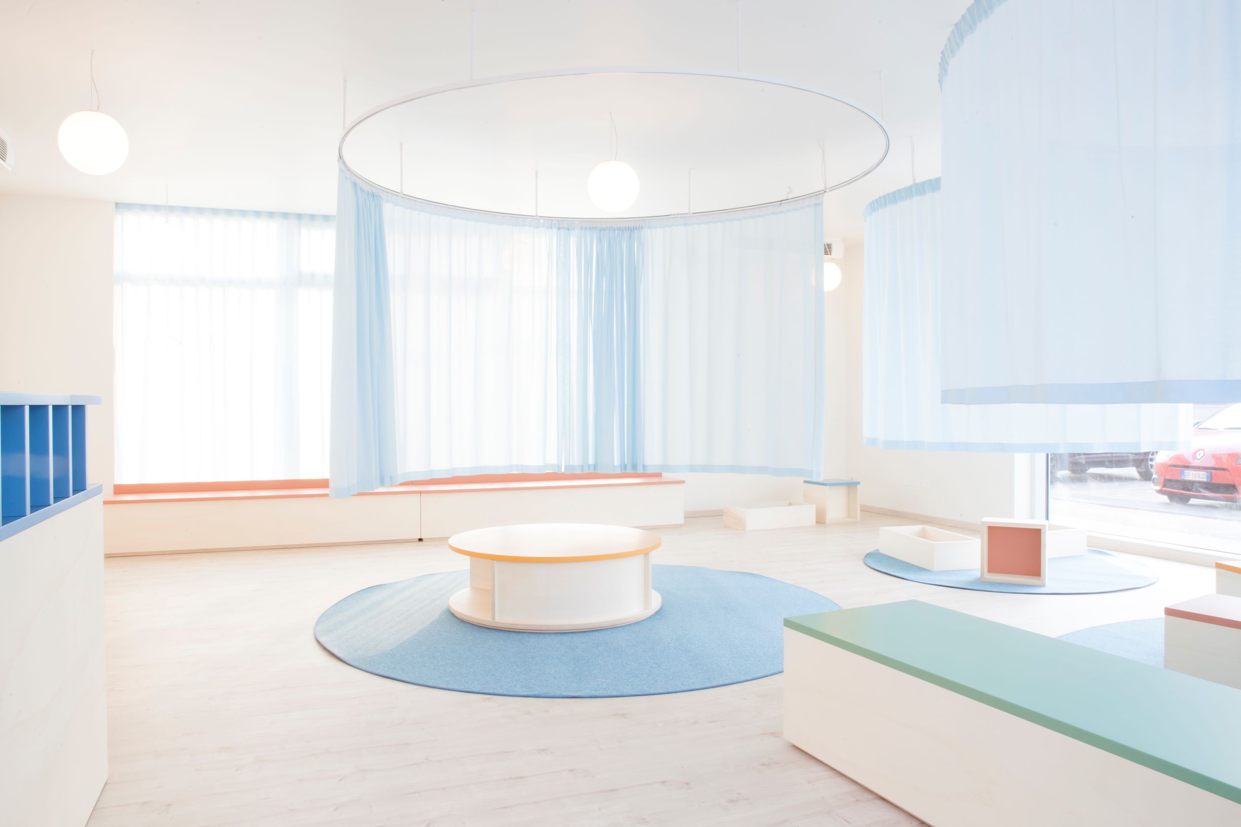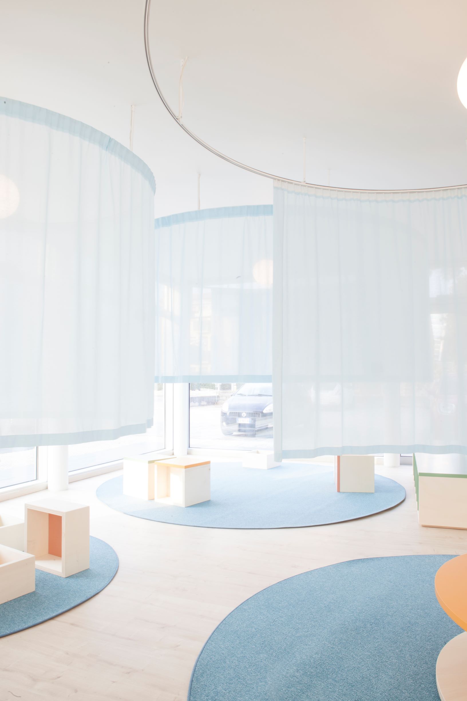 Playfulness and transparency are the themes at the base of the project for the dental clinic dedicated to children. Three distinct areas are created within the main space thanks to the use of curtains hanging from circular rails. To reinforce the limit of these spaces, there are custom-made carpets that regain the perimeter of the curtains on the ground. The feeling from the inside of these “rooms” is that of protection and intimacy, however, the visibility from the outside is ensured, so that parents have a view towards their children while they play.