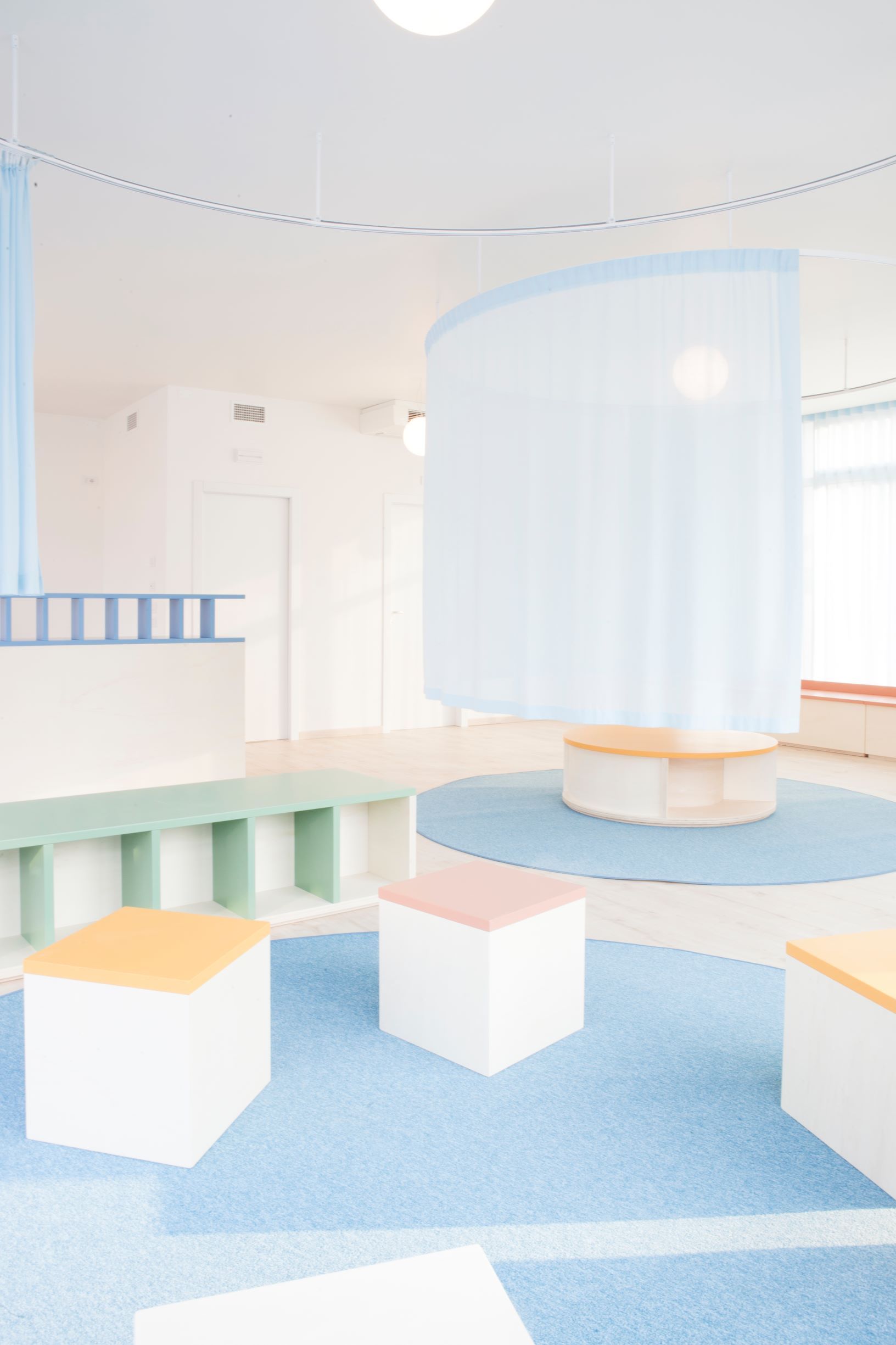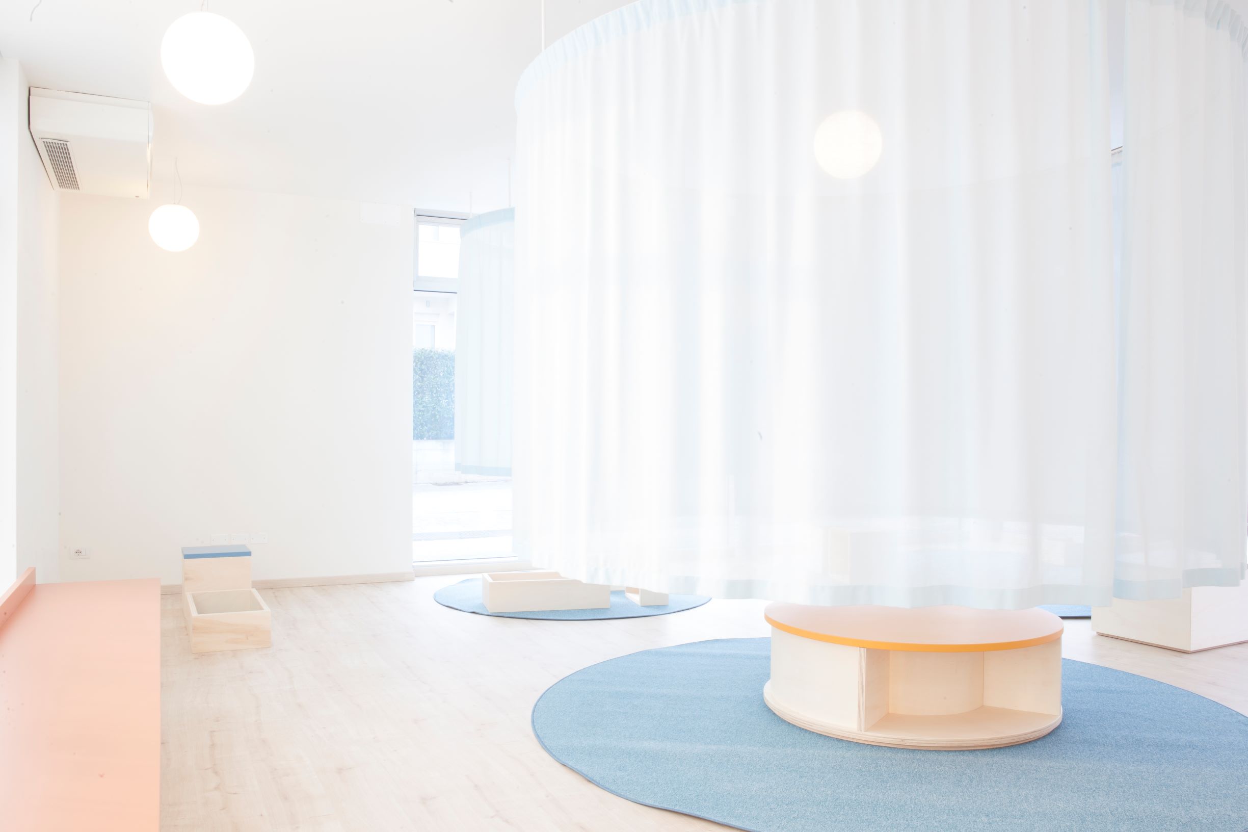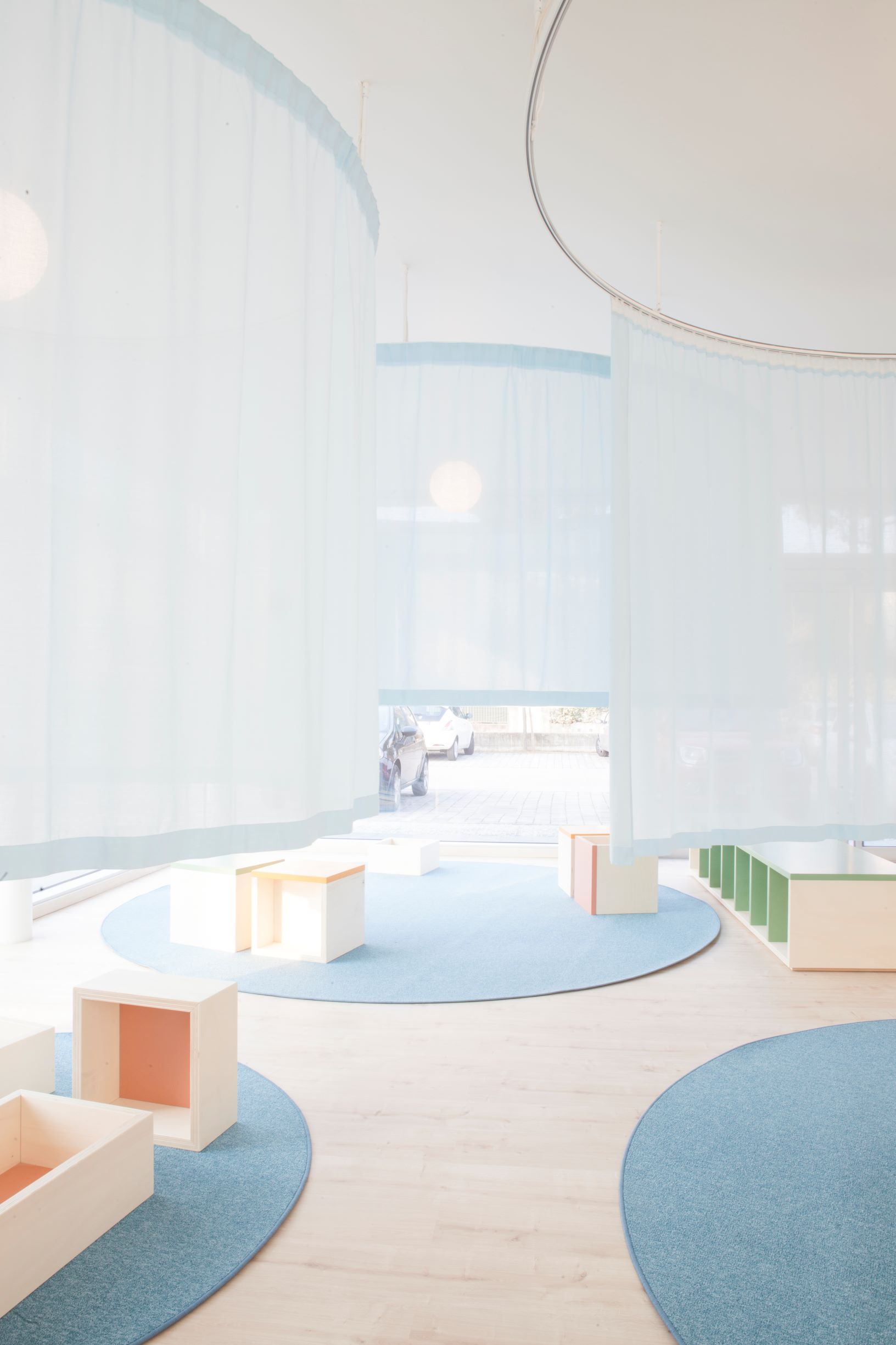 Playfulness and transparency are the themes at the base of the project for the dental clinic dedicated to children. Three distinct areas are created within the main space thanks to the use of curtains hanging from circular rails. To reinforce the limit of these spaces, there are custom-made carpets that regain the perimeter of the curtains on the ground. The feeling from the inside of these “rooms” is that of protection and intimacy, however, the visibility from the outside is ensured, so that parents have a view towards their children while they play.