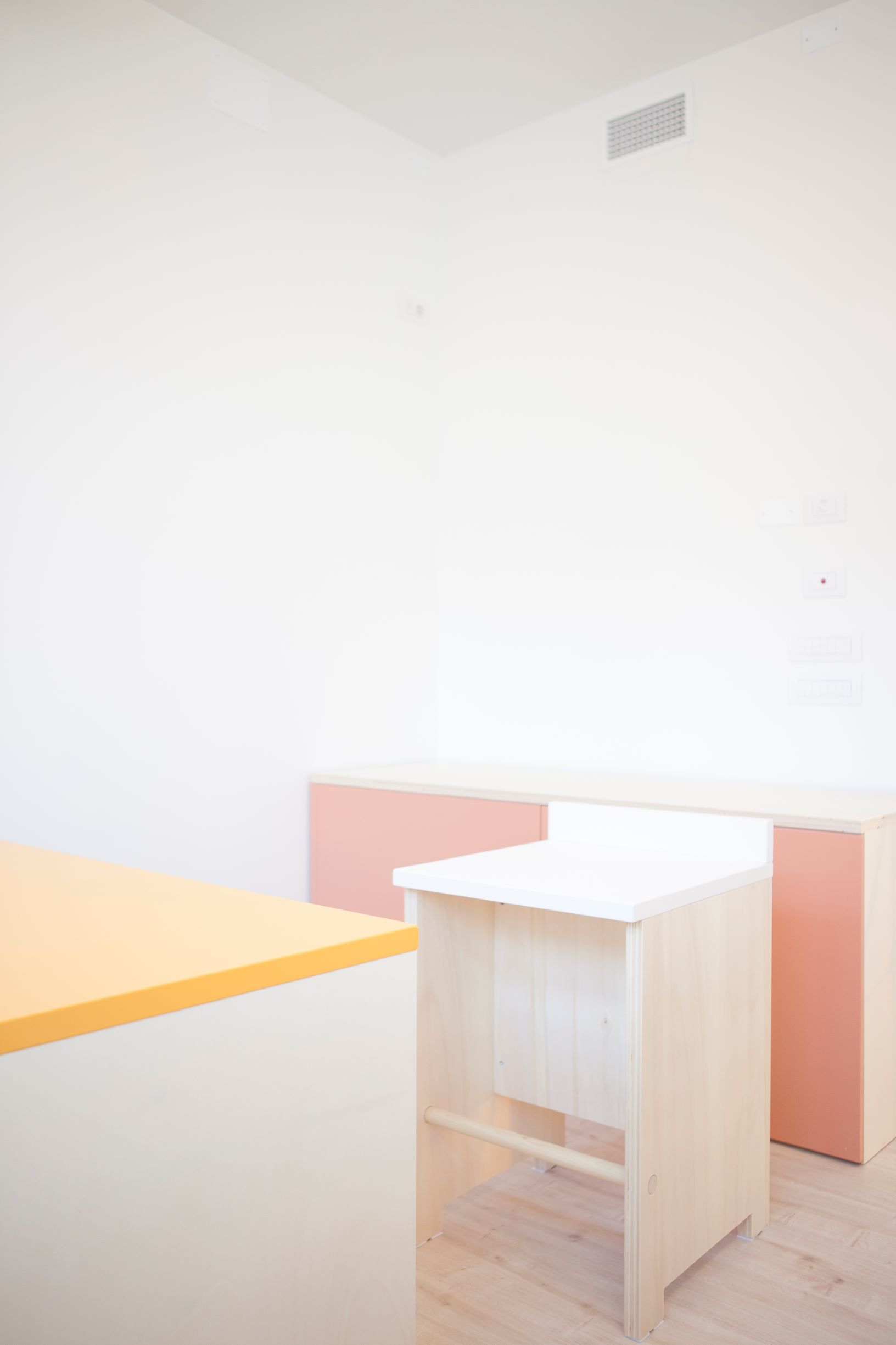 The pastel shades of the furnishings, inspired by the production of Donald Judd, and the use of natural materials, help to the achievement of a friendly and relaxed mood.