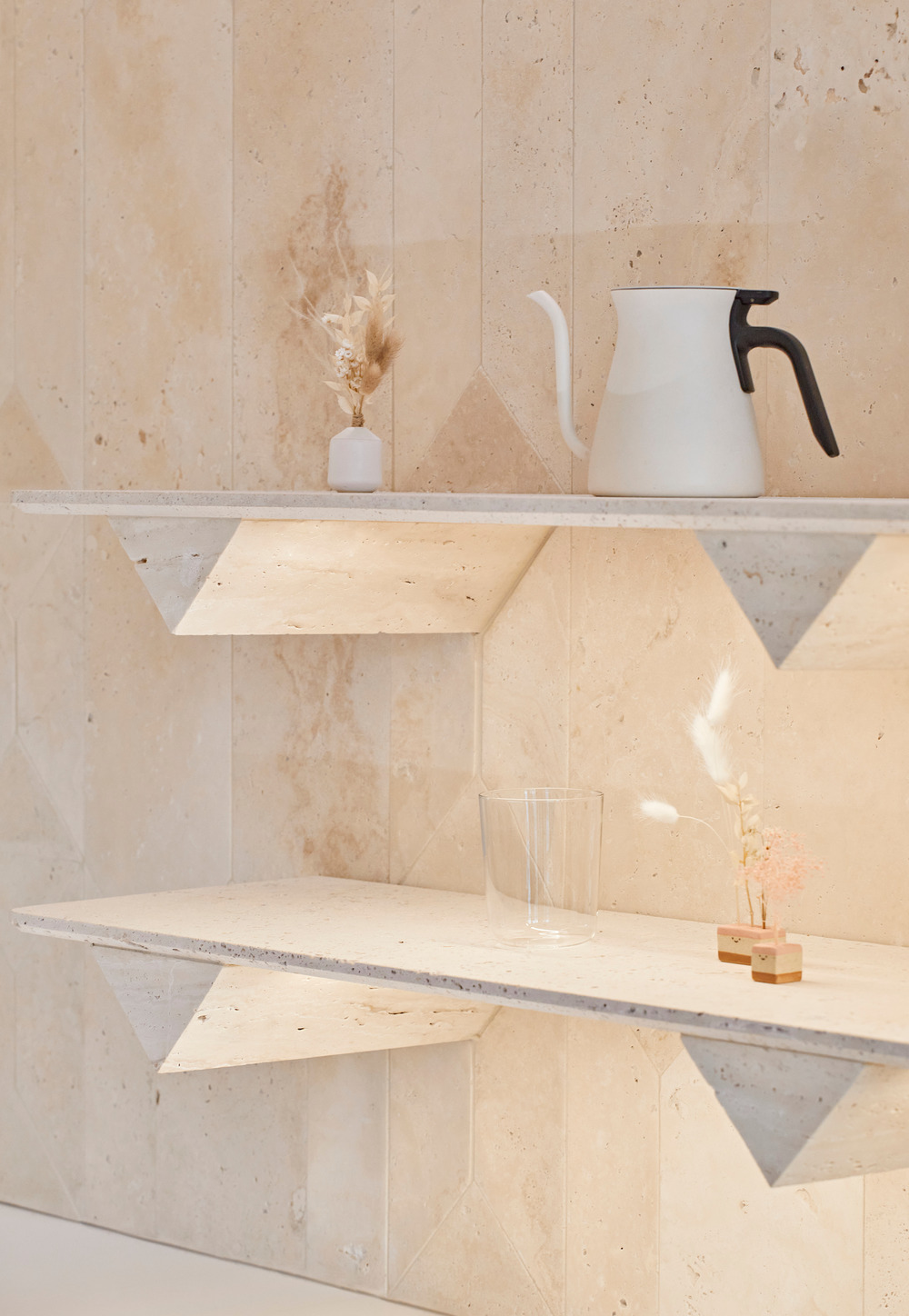 Cloud Room earns its name from moving light that collects shadows in the three dimensional travertine pattern covering the walls and ceiling, The effect mimics the shadows of moving clouds across the wall. Light moves at a very slow pace; imperceptible when stared at, but noticeable over the time it takes to order and make a coffee. Milky’s Cloud Room was designed and built by newly founded Full Fat Studio. Developed from the architectural language and graphic patterning created for Milky's by Batay-Csorba Architects, Cloud Room achieves a familiar, yet new feeling. Changes in material, colour, pattern, and details create two distinct spaces. The entire interior was custom designed and fabricated to outfit the interior of a container. The travertine walls and ceiling were machine sculpted by Marbela. Anony designed intelligent light fixtures to control the ambiance and create the cloud effect. Other fixtures, such as fibre-optic counter lights, were customized to suit the space. A miniature sized herringbone wood from Relative Space covers the floor.