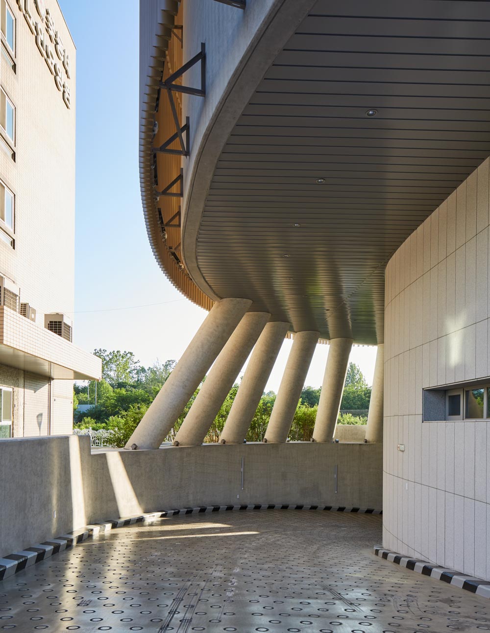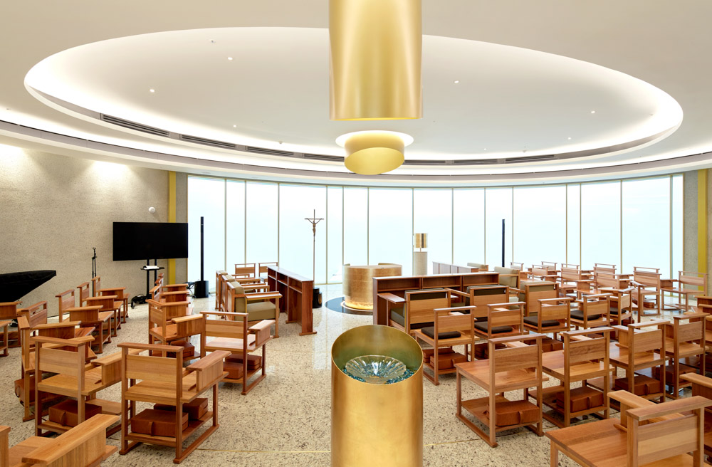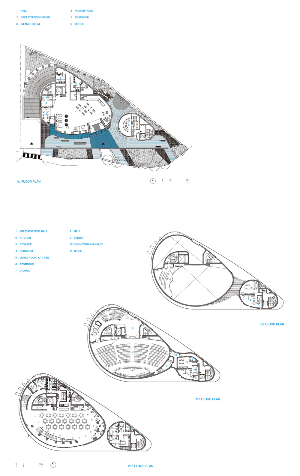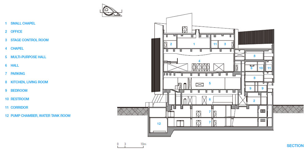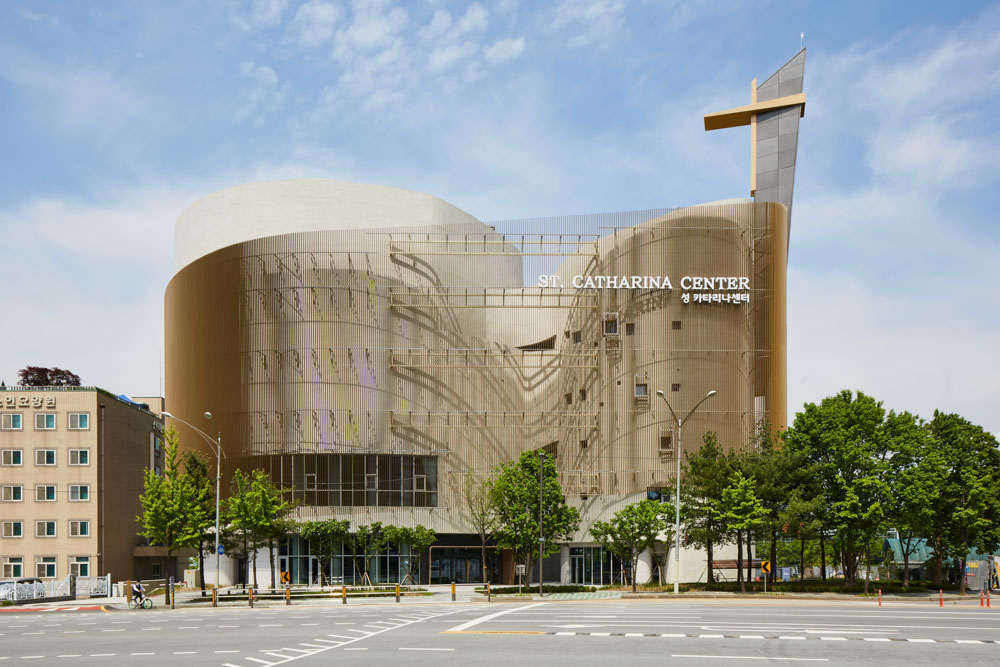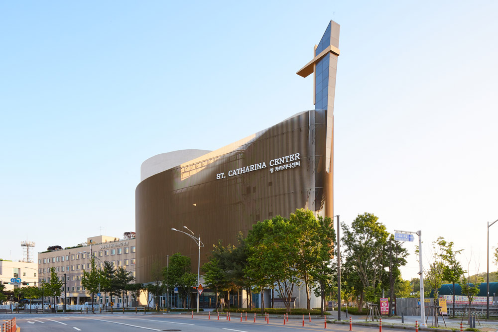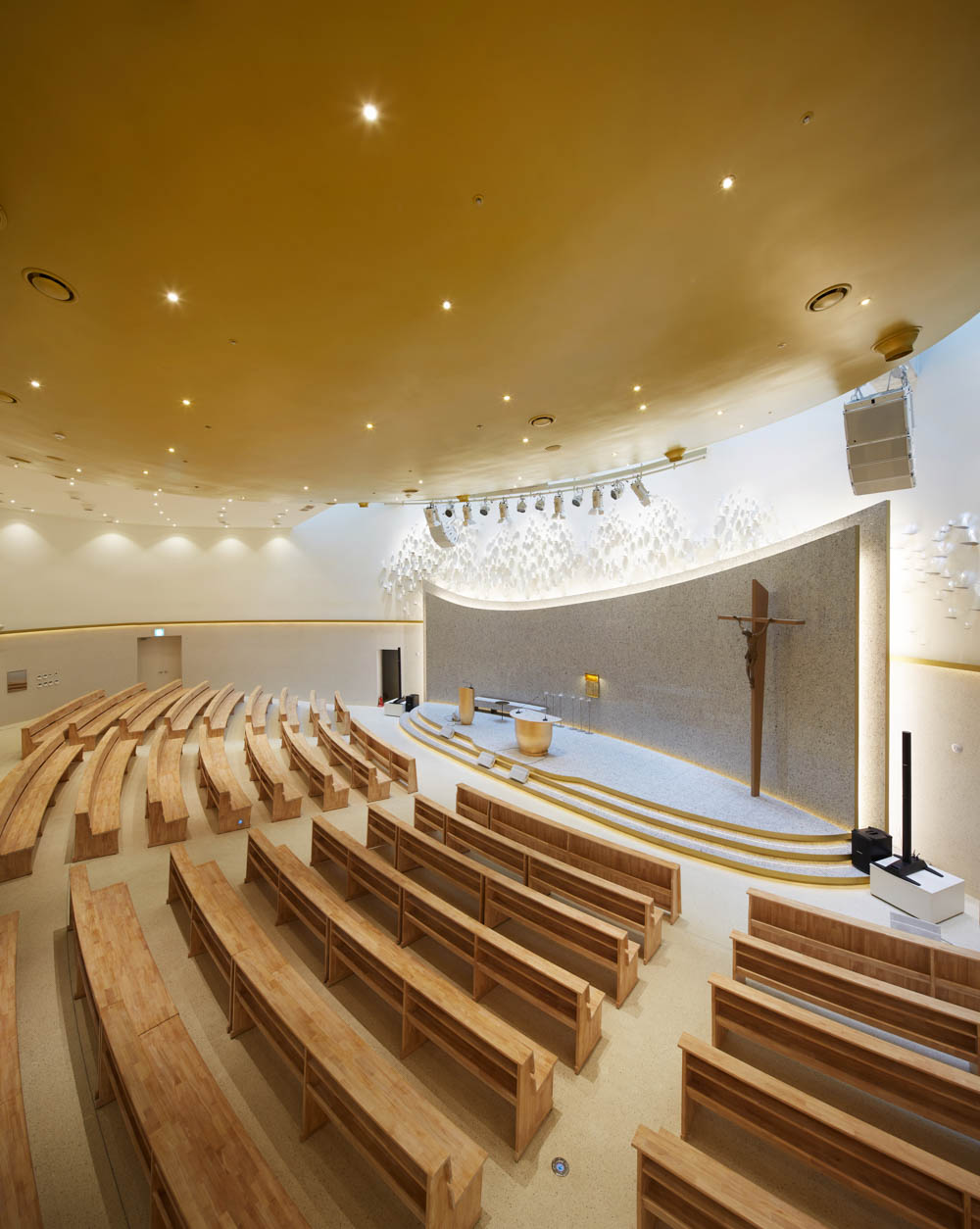 Since it is a religious facility dedicated by both parents for the daughter-in-law and daughter who died too early, the attitude towards designing the facility was unique. Constructing a public and religious facility on a triangular atypical site was a troublesome starting point. Moreover, in the part of composing the Grand Sanctuary where Mass is held, supporting facilities, and the space necessary for gatherings after Mass, we had no choice but to plan practical stairs other than the legally required emergency stairs. Despite the criticism of wasting space as such, it was planned as the main vertical flow in this facility. With our insistence on the usual design to emphasize if it is unavoidable, we thought of a double skin structure that creates a large oval and a small oval space on the triangular site and holds the two masses. In the religious etymology of the Trinity, the element of the invisible Holy Spirit is embodied in double skins.