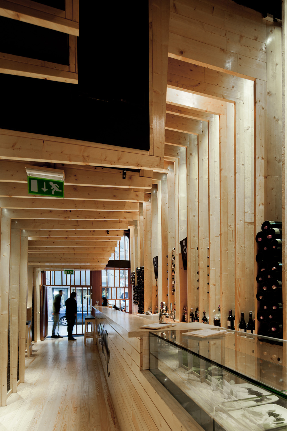 The Bar "La Bohème" (entre amis) is located in the “Galeria de Paris” street, amidst the downtown area of Porto. The redesign sought to implement and structuralize the space, creating its own identity. The solution was formalized through the texture and the colour of the wood, which defines the space and provides depth to the structure’s design. This structure, which was placed along the corridors and namely at the walls and ceiling, allows to subvert the whole appearance of the space, appealing to its visitors sense of discovery.