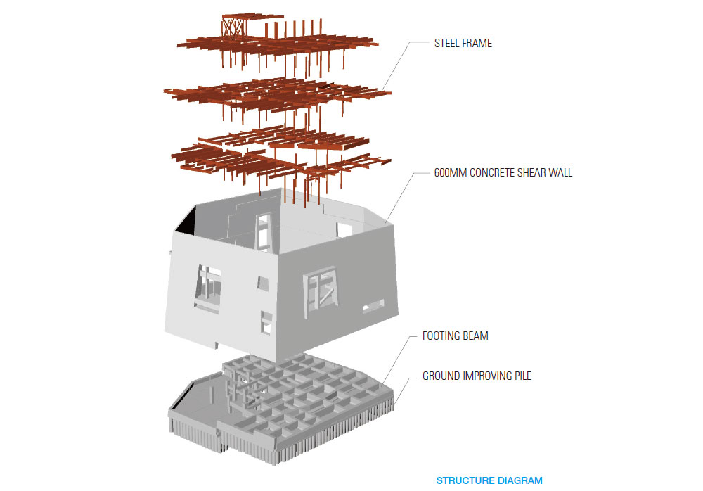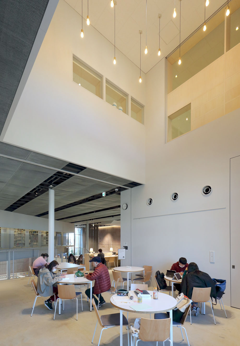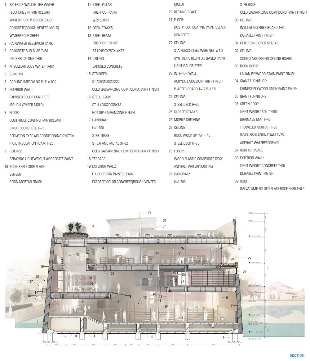 This led us to envision a building with outer walls standing powerfully in the water, more similar to a civil engineering project than an architectural one. In order to protect the building from water, absorb horizontal force during earthquakes, and provide the needed insulation, we chose to construct these walls from 600mm reinforced concrete, three times thicker than what is normally used. We included only as many windows as were needed to provide the natural light and ventilation for a pleasant reading environment. The gradually staggered floors reveal glimpses of the adjacent floors, resulting in a unified space. The spiraling circulation route gives rise to rich sensorial experiences as patrons move multidimensionally through the book-filled space and also pulls air through the building. The building’s concrete surface bears varied patterns from the rough plywood formwork used to construct it, creating a texture that seamlessly absorbs the changes brought about by time. Within this building, a sense of the grand scale of time evoked by the massive outer walls coexists with a sense of everyday time evoked by the rippling water and passing pedestrians and bicyclists.