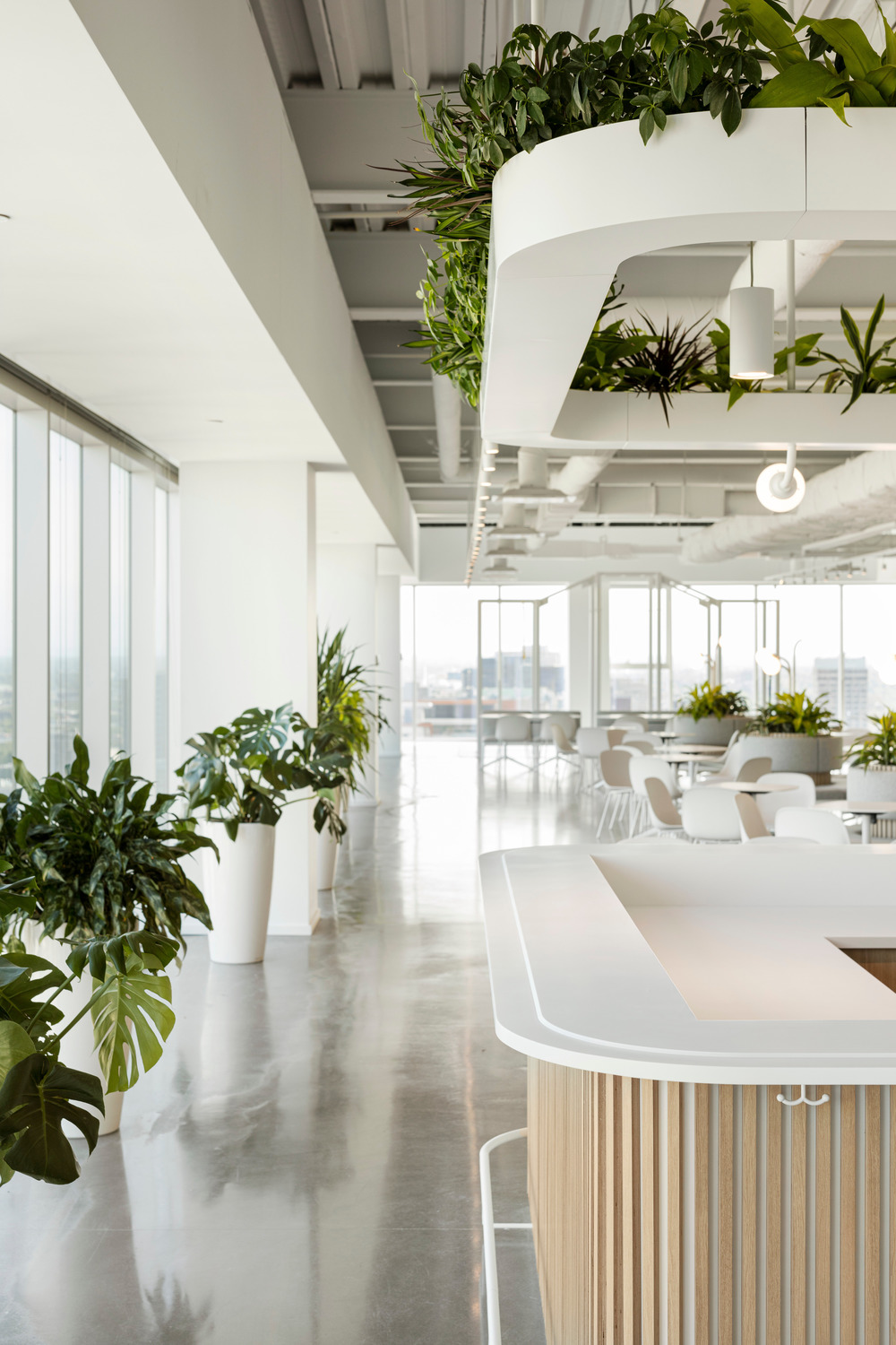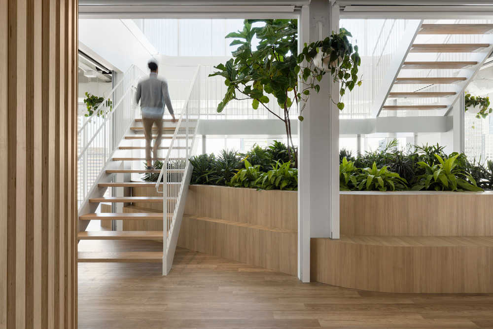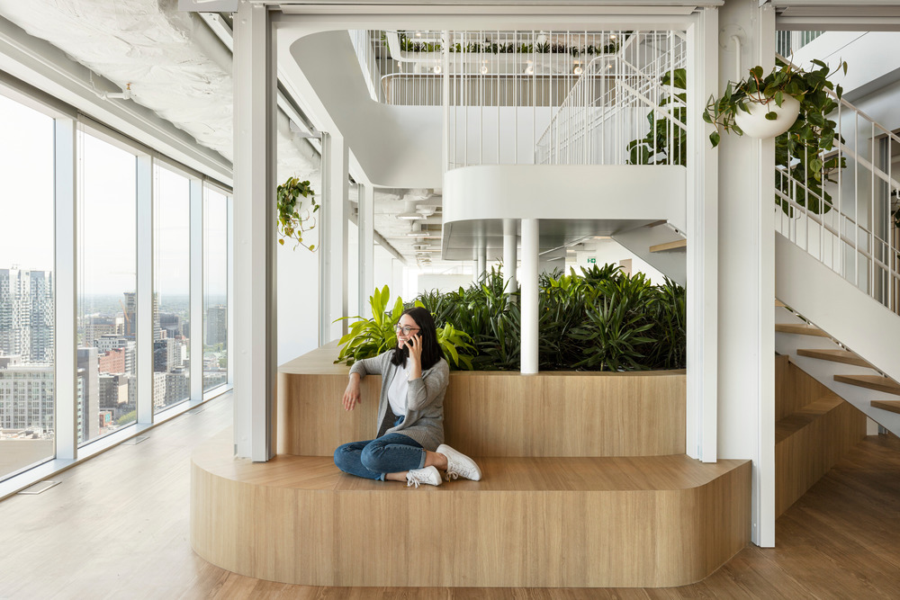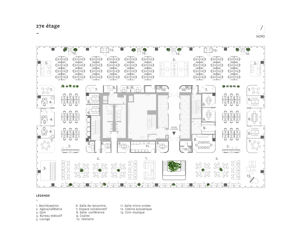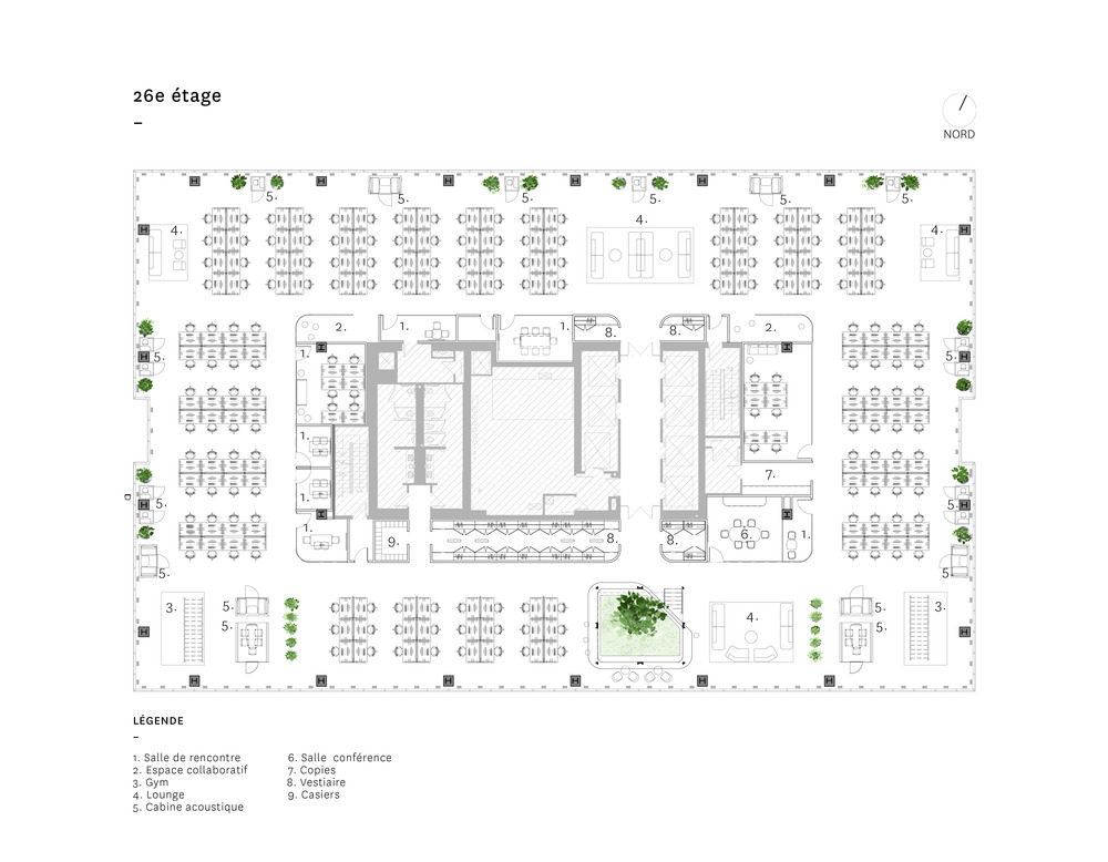 The bar-café serves as both a meeting place for employees and a reception area for visitors, making the arrival more convivial and less formal. On either side of this bar is the agora/cafeteria, which acts as the lungs of the project. The latter is located on the south side of the building, where the view is the best because of the presence of the Old Port and the river. "The idea was to make this view accessible to everyone," explains the designers. This area is meant to be inviting because of its outdoor garden aspect set up by its custom-made furniture with lampposts reminiscent of city gardens. The abundance of vegetation enriches the work environment and makes it pleasant and soothing. The aim is to put forward the spirit of an indoor garden. "It is through these gestures that the threshold between exterior and interior loses its definition and challenges our relationship with the exterior, even when we are more than 25 floors above ground level. Located at the ends, the sports areas have been designed as open spaces. These high bar courses add a playful touch to the work environment. It is not uncommon to see employees taking a break while moving.