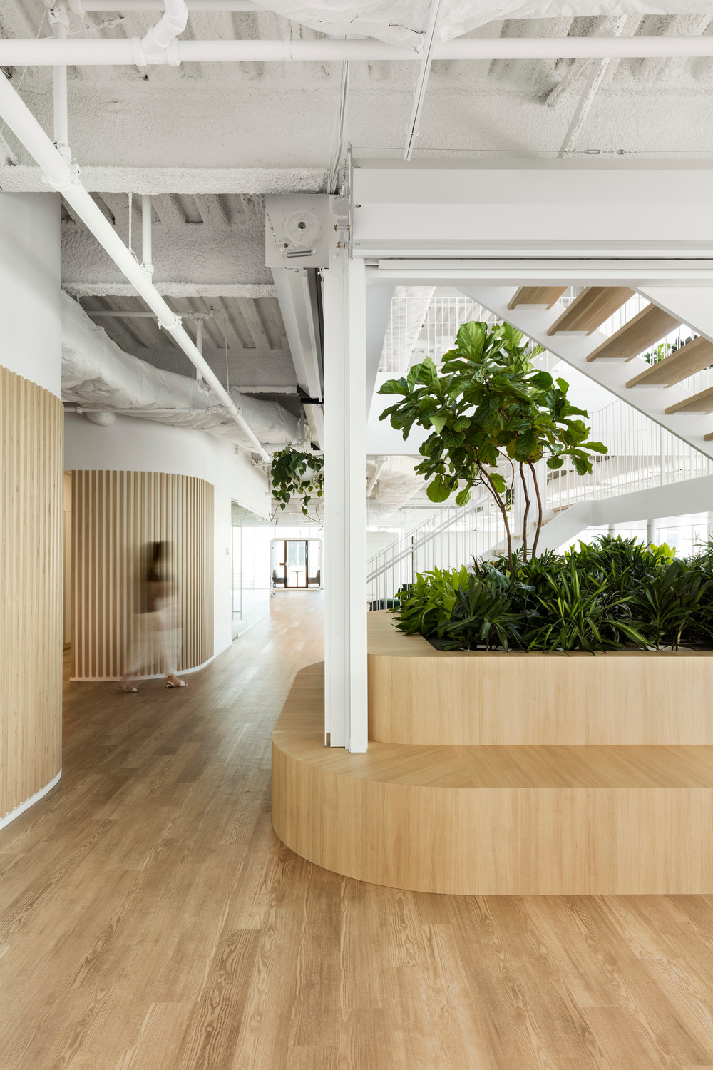 Overall, the materiality of the project is simple, neutral and timeless. The work combines wood, transparency, raw concrete and white. The idea was to work on linearity and curvature for all the installations. The curve adds a softness to the work environment while reflecting the light that falls on it. These gestures are intended to finely evoke nature in addition to leaving room for the viewer by their purity and their nuanced details. These various interventions are the result of a biophilic reflection that aims to integrate and design inspiring places that bring human beings closer to their environment through natural systems and attractions. Research has shown that designs that connect us to nature not only inspire us, but also improve our productivity and even our well-being. The lounges, the only coloured spaces in the project, give a more relaxed and invigorating feel to the work areas.