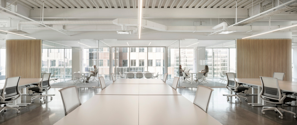 With a mandate to design an environment with as few walls as possible, while integrating sports areas, a cafeteria, employee locker and brainstorming areas as well as meeting rooms for an occupancy of up to 283 employees, ISSADESIGN had to be creative in order to put in place an environment that would be consistent with the client's needs. The idea was to anchor the development in a perspective of sustainability, both in the use of the infrastructures and in the redefinition of the needs of the workers. To achieve this, the meeting rooms revolve around the central core of the building, allowing natural light to flood the work areas and other informal collaborative spaces. Soundproofed glass cubicles surround the windows of the floors to provide employees with private work spaces close to their personal work space. The connection between employees is favoured by the installation of a floor opening facilitating access from one floor to the other and offering an even more striking view of the city from the arrival of clients on the 27th floor.