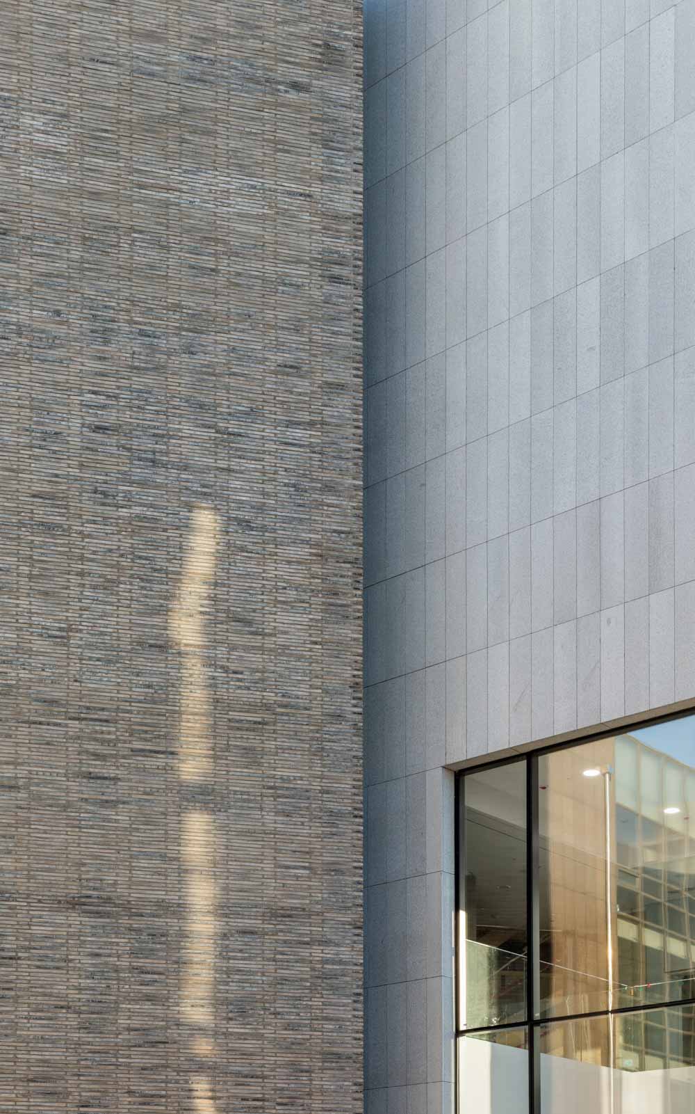 4개의 정방형으로 분리된 건물은 보는 방향에 따라 2개 또는 3개의 건물이 결합한 듯 보인다. 분리된 건물의 매스는 유리, 벽돌, 화강석의 서로 다른 재료를 사용하여 그 차이를 두었다. 정면의 주 출입구 부분에는 저철분 유리로 만들어진 투명 커튼월로 마감하고, 도로 보행로를 따라 외부공간이 조성되어 있어, 건축물 안팎으로 개방감을 강조한다. 벽돌 조적 부분, 수직창의 다변적인 활용은 인접 건물과의 조화를 위해 디자인됐다. 깊이감과 음영이 강조된 벽돌 입면은 보행자와 사용자가 건물을 가까이서 올려다보거나, 도로에서 시선 높이에서 바라봤을 때를 고려한 것이다. 배면과 좌측면에 사용된 수직 방향의 화강석 줄다듬은 자재의 색상과 질감을 돋보이게 만든다. 내부 공간은 불규칙한 대지 형상에 대응하는 구획과 더불어, 변화하는 요구 조건에 대응하는 가변적인 공간이다. 이러한 내부의 가변성은 철근콘크리트 장스팬 구조로 설계되어 기둥이 없는 넓고 활용도 높은 공간을 구축했으며, 3층과 4층을 연결하는 복층 부분은 필요시 2개의 공간이 유기적으로 통합되어서 사용되도록 설계됐다.