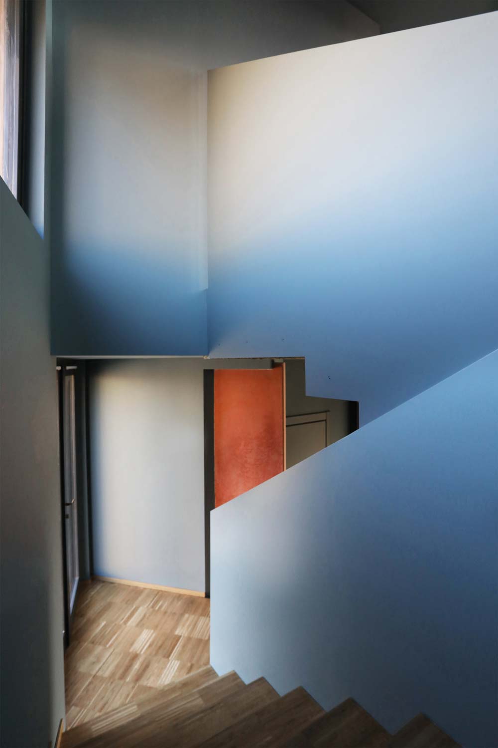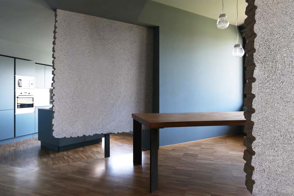 The Houses of Cards, built in an allotment of a small town in the province of Turin, in Northern Italy, are part of the experimentatio phase on the large granite slab for use as a load-bearing construction element. Both houses consist of a triple level of superimposed septa that connect thanks to a system of cuts and metal dowels. During the structural design phase, for normative reasons related to their certification, we chose to combine granite slabs with other concrete panels. This allowed us to study the material without having to go through a lengthy certification process which would have delayed and perhaps compromised the possibility of completing the project. Working in combination with the colored concrete panels has helped us to understand the limits and opportunities of this material. This is now helping us to develop the research and carry on the experimentation on pre-cast concrete through some other projects we have now underway.