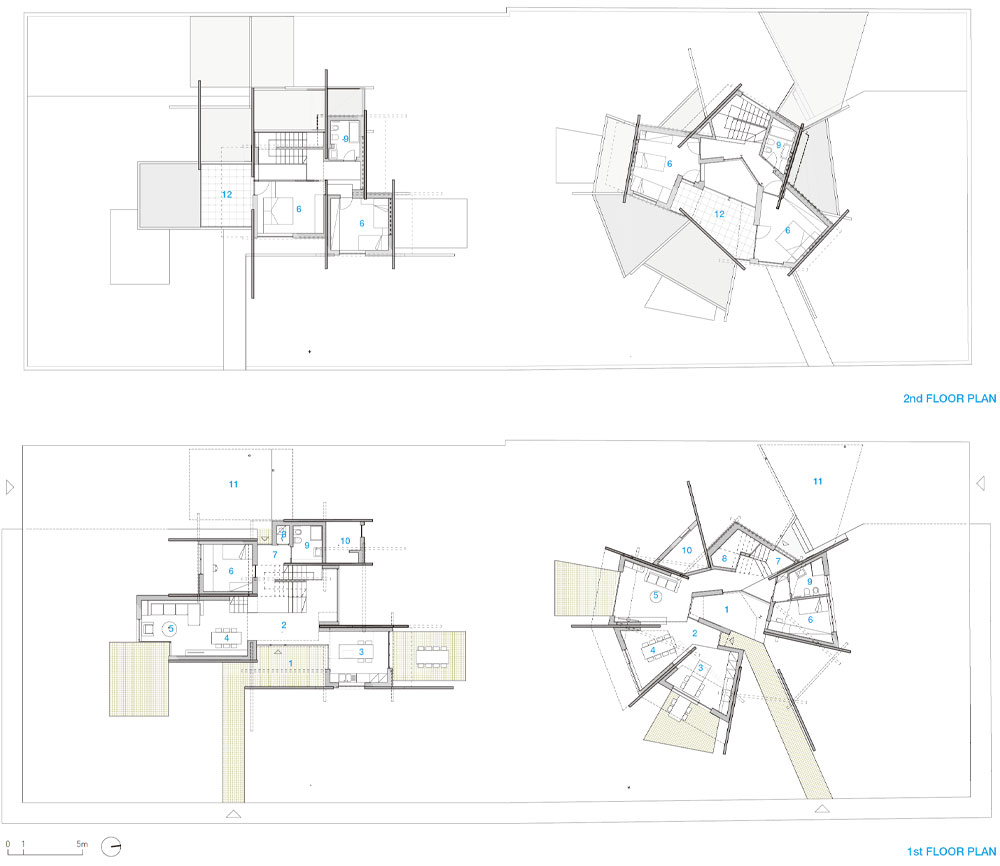 Research and experimentation on the material has therefore developed in hand-in-hand with that on the structural system based on load-bearing panels. The shape of the two houses comes from a sequential approach to the project. Starting from a regular and intuitive scheme - the Cat House - we developed a second project - the Dog House - in which the theoretical problems identified in the structure of the first building are solved by form.This produced more complex spaces. The Cat House has an orthogonal structure which determines its weakness in reacting to forces produced by an hypothetical earthquake; the dry mounted panels therefore needs metal bracings and reinforcements to resist transverse forces. The Dog House, instead, thanks to its shape developed around a central courtyard, does not require additional bracings. The complexity of its radial form produces a structurally efficient building.