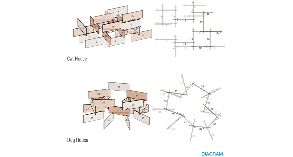 건축 자재에 대한 연구와 실험은 하중 지지 패널을 기반으로 하는 구조 시스템과 함께 개발되었다. 두 집의 형태는 프로젝트에 대한 순차적인 접근에서 비롯된다. 캣하우스라는 규칙적이고 직관적인 체계에서 출발하여 첫 번째 주택에서 파악된 이론적 문제를 형태별로 해결하는 두 번째 주택인 도그하우스를 건설했다. 이렇게 더욱 정교하고 복잡한 공간을 구성할 수 있었다. 캣하우스는 직교 그리드를 기반으로 하는 구조로 되어 있어 내진 성능을 기대할 수 없었다. 카드처럼 끼워진 슬라브와 패널은 횡력에 저항하기 위해 보강재가 필요했다. 대신, 도그하우스는 중정을 중심으로 방사형 배치 형태를 따르기 때문에 별도의 버팀목이 필요 없었다. 방사형이 가진 복잡성은 곧 구조적으로 효율적이기 때문이다.
