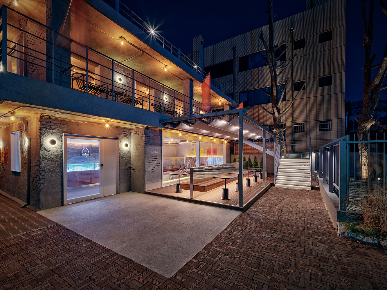 도심속의 해변과 같은 모티브에서 출발한 ‘샌디비치 베이크 하우스’의 전체적인 톤은 도심의 회색이다. 햇살이 좋은날 이 도심의 벽은 해변 모래성과 같은 금색의 색감과 질감을 연출한다. 건물과 함께 오랜시간 그 자리에 위치한 두 은행나무를 없애기보다 시간을 덧입혀 회색공간에 생기를 불어 일으켜 생동감을 준다.