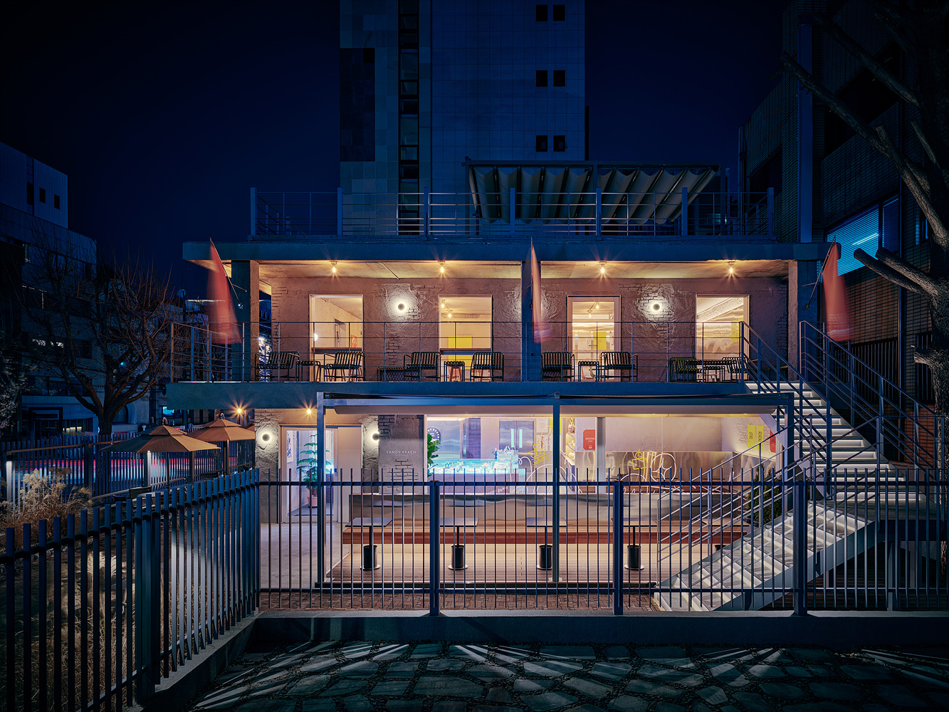2층 홀로 들어오면 좀 더 여유로운 공간이 펼쳐진다. 좌석의 배치가 넓찍히 여유로운 2층 홀은 외부를 보며 앉을수 있는 바 형태의 좌석, 안정적인 벽면의 붙박이 좌석, 식물과 함께 공간의 포인트를 담당하는 포토존, 여유로운 구성의 이동좌석으로 구성되어있다. 전체적인 톤과 자재를 줄여 은은한 분위기를 만들고 포인트 적인 로고, 액자, 식재를 통해 공간을 과하지 않고 여유롭게끔 유도하려 하였다. 창가, 액자 등의 아트워크는 딱딱하지 않고 위트있는 형태로 공간과의 대비, 조화를 만들었다. 2층에서 외부 테라스로 나가면 해변의 살랑거리는 바람을 시각적으로 느낄수 있게 플래그 간판과 함께 외부 좌석이 자리한다. 여유로운 공간을 지나 루프탑을 계단을 통해 올라가면 가장 해변과 같은 공간이 펼쳐진다. 해변의 모래알과 같은 바닥의 콩자갈과 함께 해변에서 볼법한 외부 가구들, 커다란 어닝이 시원한 하늘과 함께 펼쳐진다.