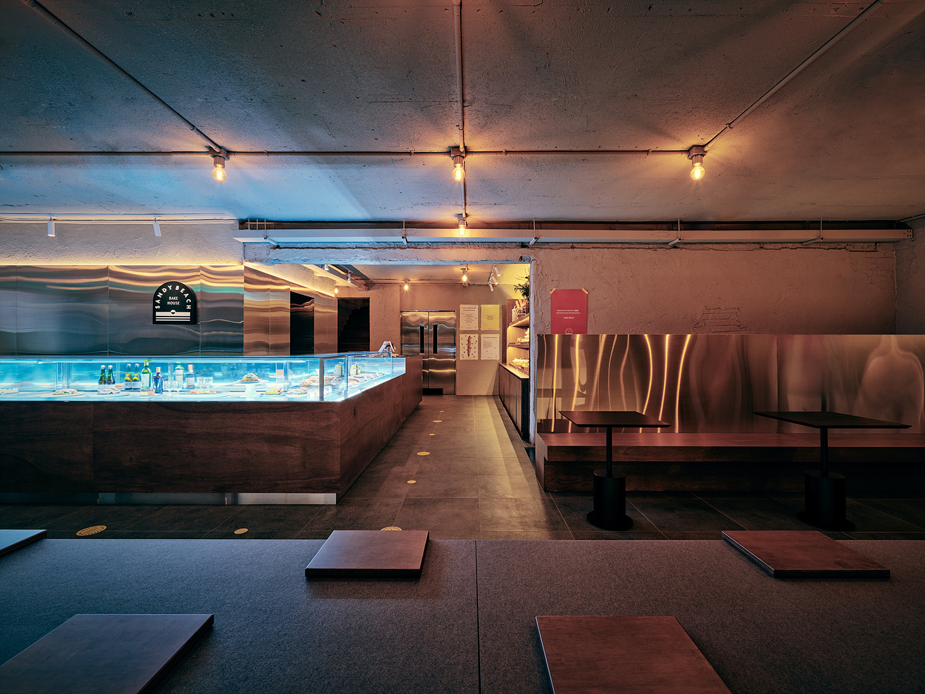 Sitting in a sitting area using felt on the first floor and a built-in chair, coffee and bread eaten in the sunlight reflected in the outside window allow you to relax in the city center. ‘BAKERY LAB’, which will be seen on the first floor along the ongoing bake parade, is a space for the development of new bread and lectures on bakery studios, showing pride in bread at Sandy Beach Bake House. After passing BACKERY LAB, you can feel a new space on both sides. It is a warmer space surrounded by wood textures than ever, and it is a private room with velvet curtain points such as the identity of Sandy Beach Bake House on one side, the sales and exhibition space showing the logo, and the secret beach on the other side.