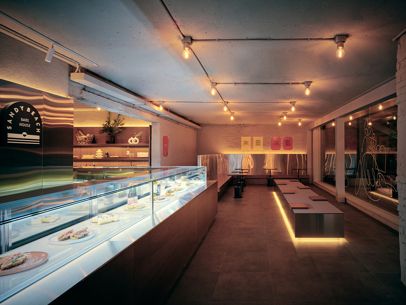 입구로 향하는 마당은 일반적인 블록을 사용하되 패턴과 형태의 다양성을 줘 이색적인 느낌을 주었다. 갈대를 따라 마당으로 들어가면 시원하게 뚫린 형태의 외부 좌석과 느슨한 형태의 어닝, 2층으로 향하는 계단을 맞이한다. 선선한 바람과 함께 어닝 아래 앉아 커피를 즐기자면 도심의 긴장을 잠깐이고 잊을 수 있다. 입구를 들어오면 ‘샌디비치 베이크 하우스’의 이름에 걸맞은 광활하고 다양한 샌드위치, 디저트, 빵이 펼쳐져 있다. 빵의 퍼레이드를 바탕하는 벽면 금속판재는 조명과 아울러 노을이 지는 해변의 모습을 연상시키고자 하였다.