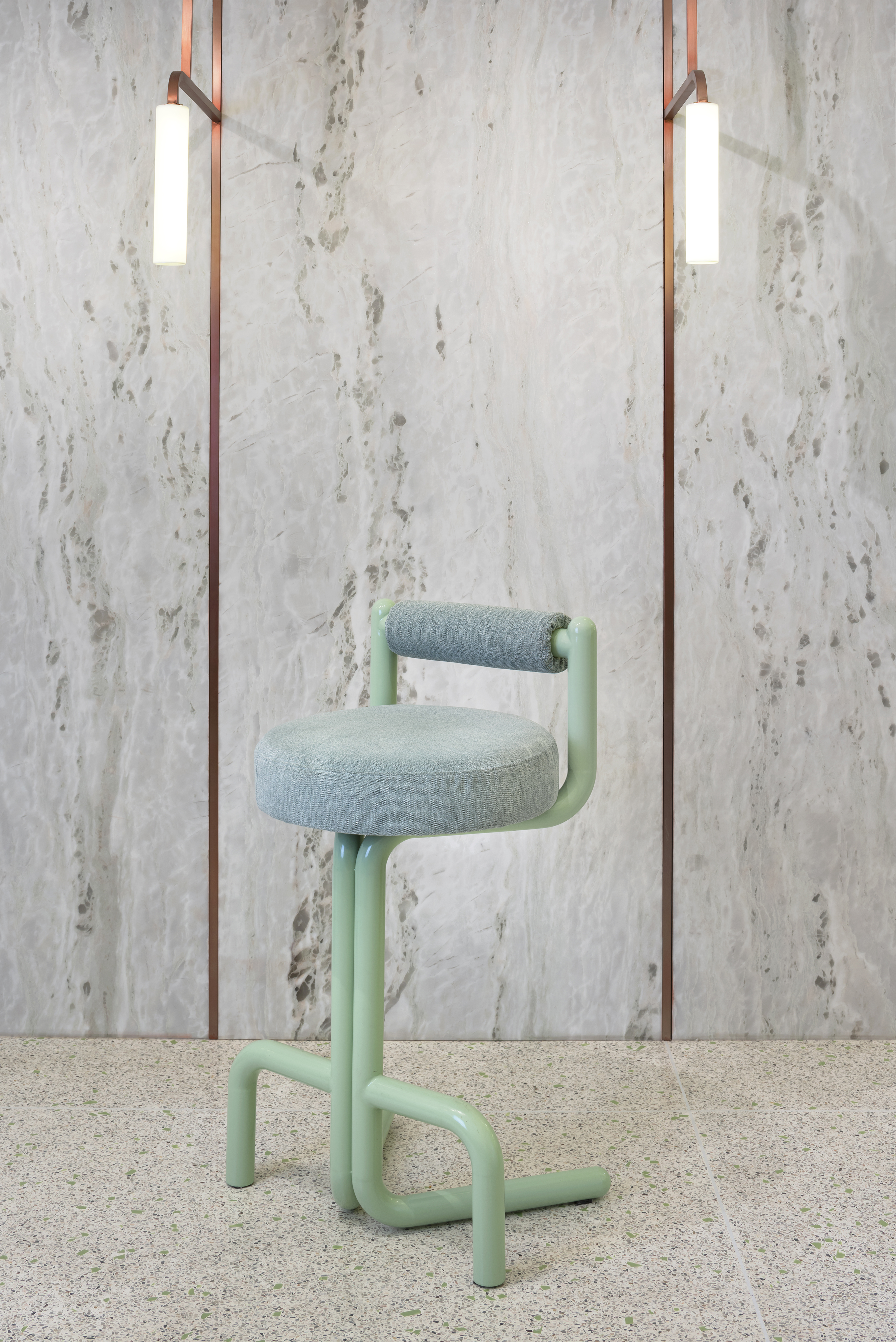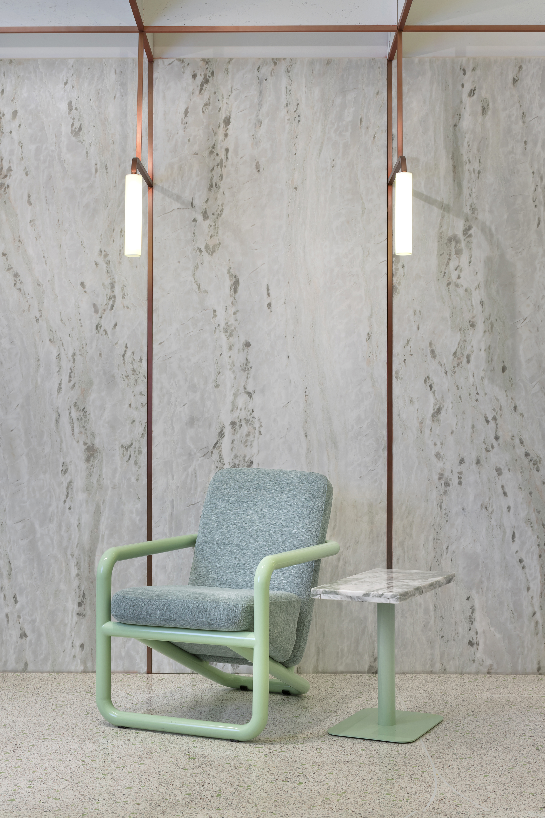 The furniture in the lobby is all part of Space Popular's latest collection, which features a lounge chair, a bar stool, a reclining chair with built in legrest, a side table, and a coffee table. All the pieces in the series are structured by mint green thick metal tubes combined with light petroleum blue upholstery. Together they construct an identity for the space while providing comfort in different forms.