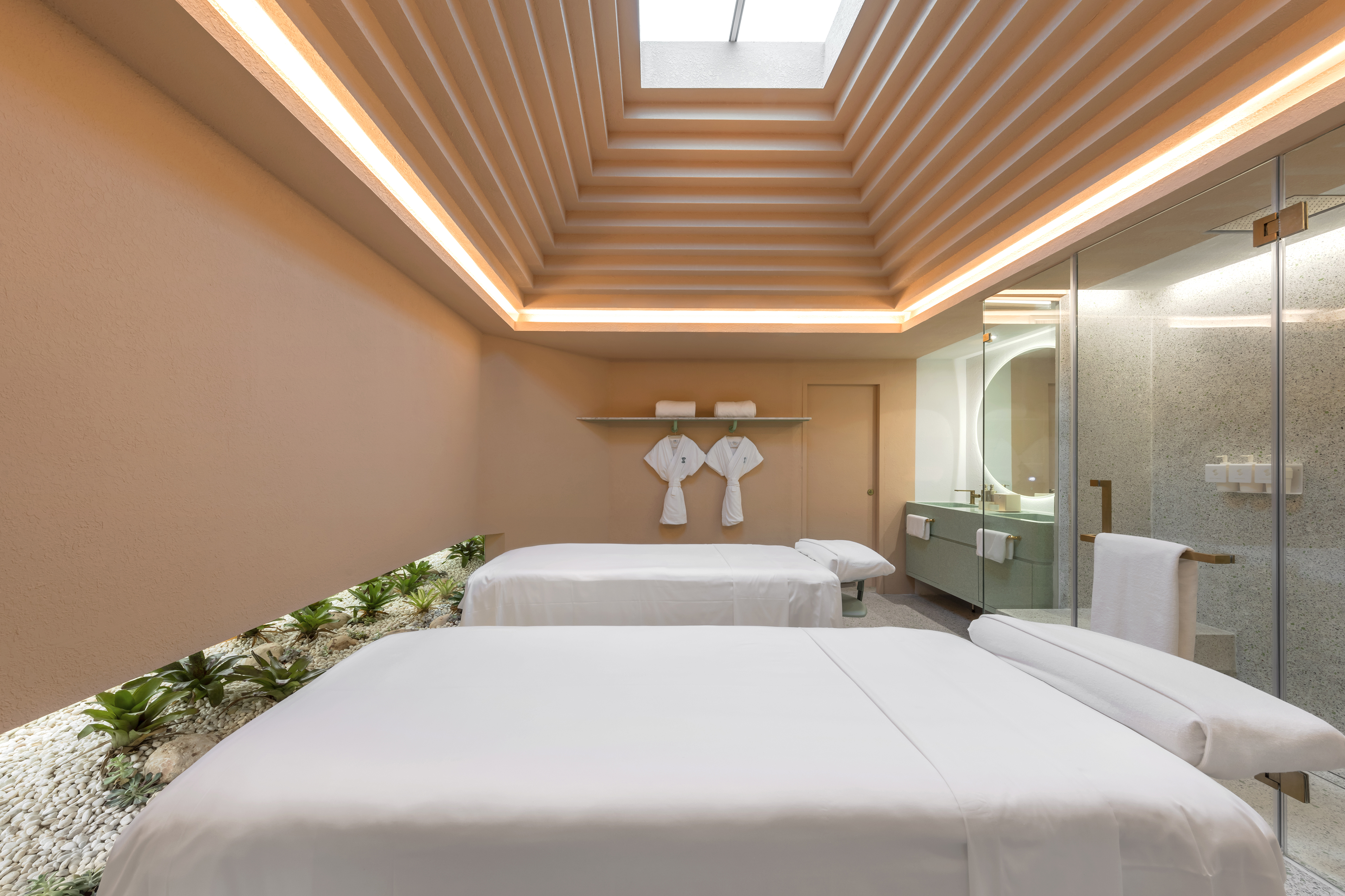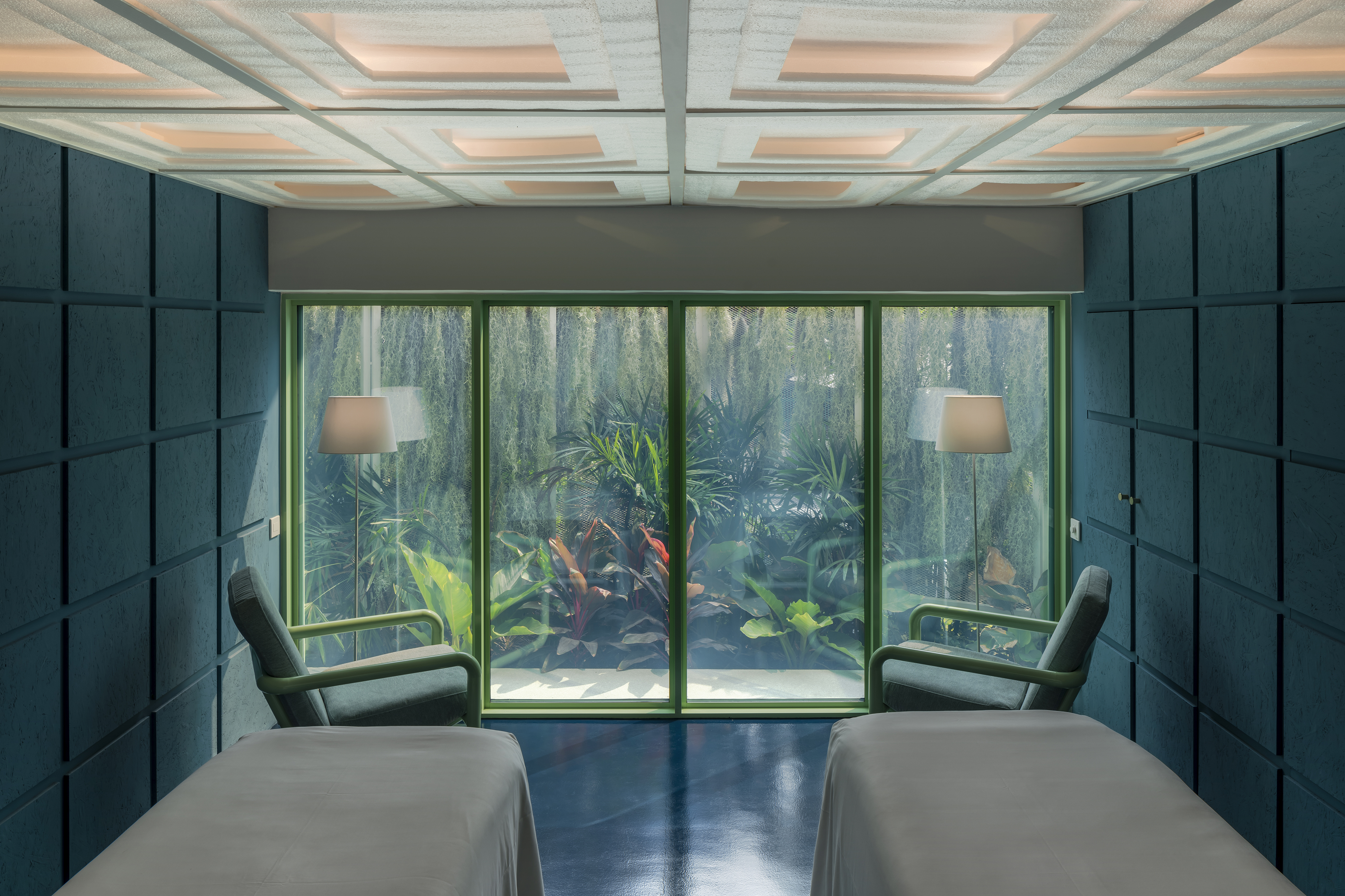 중앙 리셉션 공간과 5개의 개별 좌석 공간이 있는 공간은 3가지 유형의 치료실로 연결된다. 정원을 마주보고 있는 더블룸은 대조적인 재료를 통해 서로 다른 영역으로 구조화되어 있다. 스팀 샤워실과 화장실이 있는 젖은 영역은 옅은 분홍색 테라조와 질감이 있는 석고 표면으로 처리된 반면 마사지 및 라운지 영역은 벽에는 음향 패널이 있고 천장에는 포장 거품이 격자무늬로 되어 있는 어두운 파란색이다. 정원을 마주하지 않는 스위트룸은 그 자체로 분리된 공간이다. 질감이 있는 회반죽 지구라트 천장과 모래색 색상을 갖춘 이 방은 수백 층의 타워 아래 묻혀있어도 야외의 분위기를 연출할 수 있는 방이다. 싱글룸이 가장 밝으며 백라이트 커튼과 폼을 사용하여 작은 크기를 보완했다. 복도는 두 가지 색으로 칠해진 나무 지느러미로 덮여 있으며, 입구와 출구의 다른 톤을 보여준다.