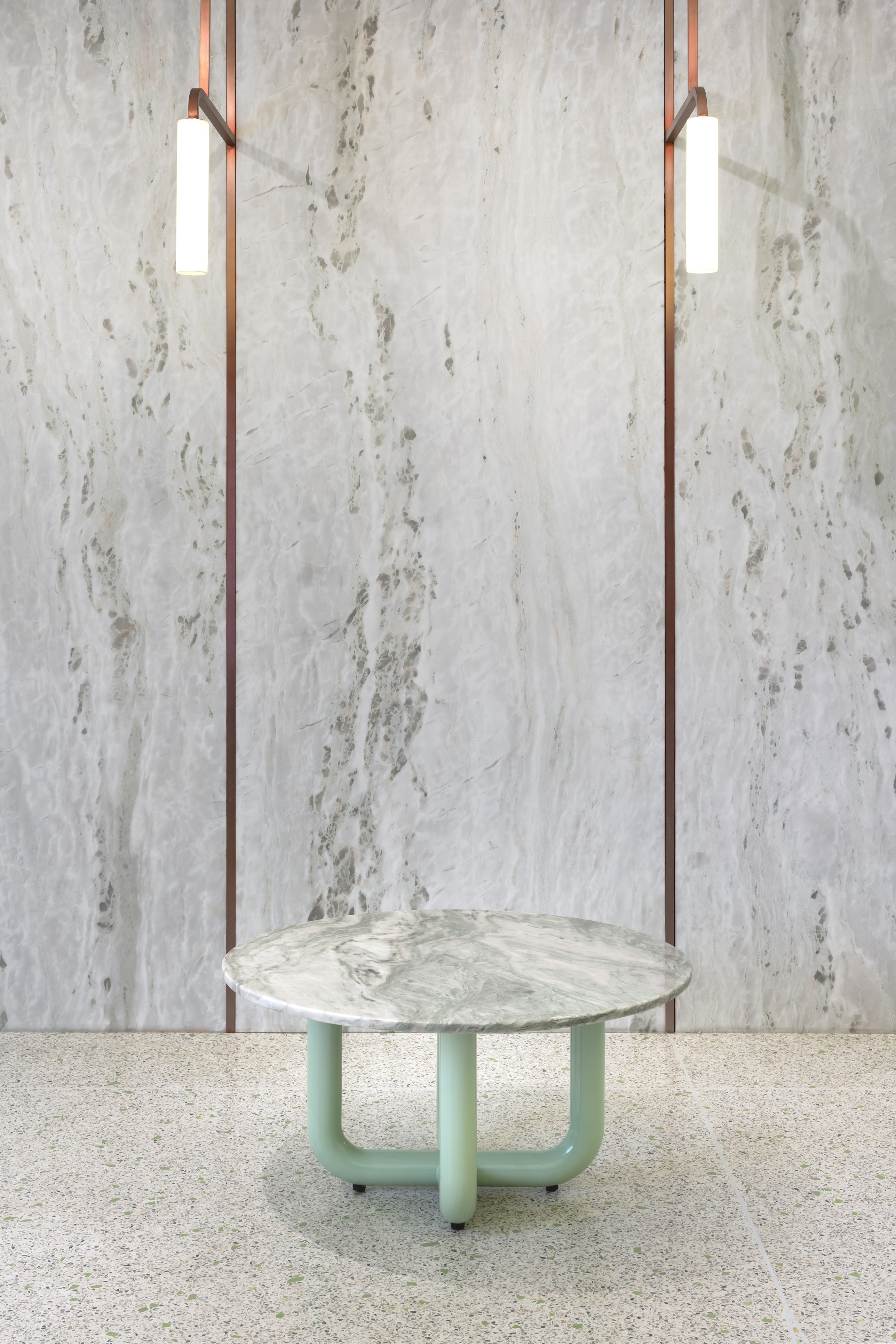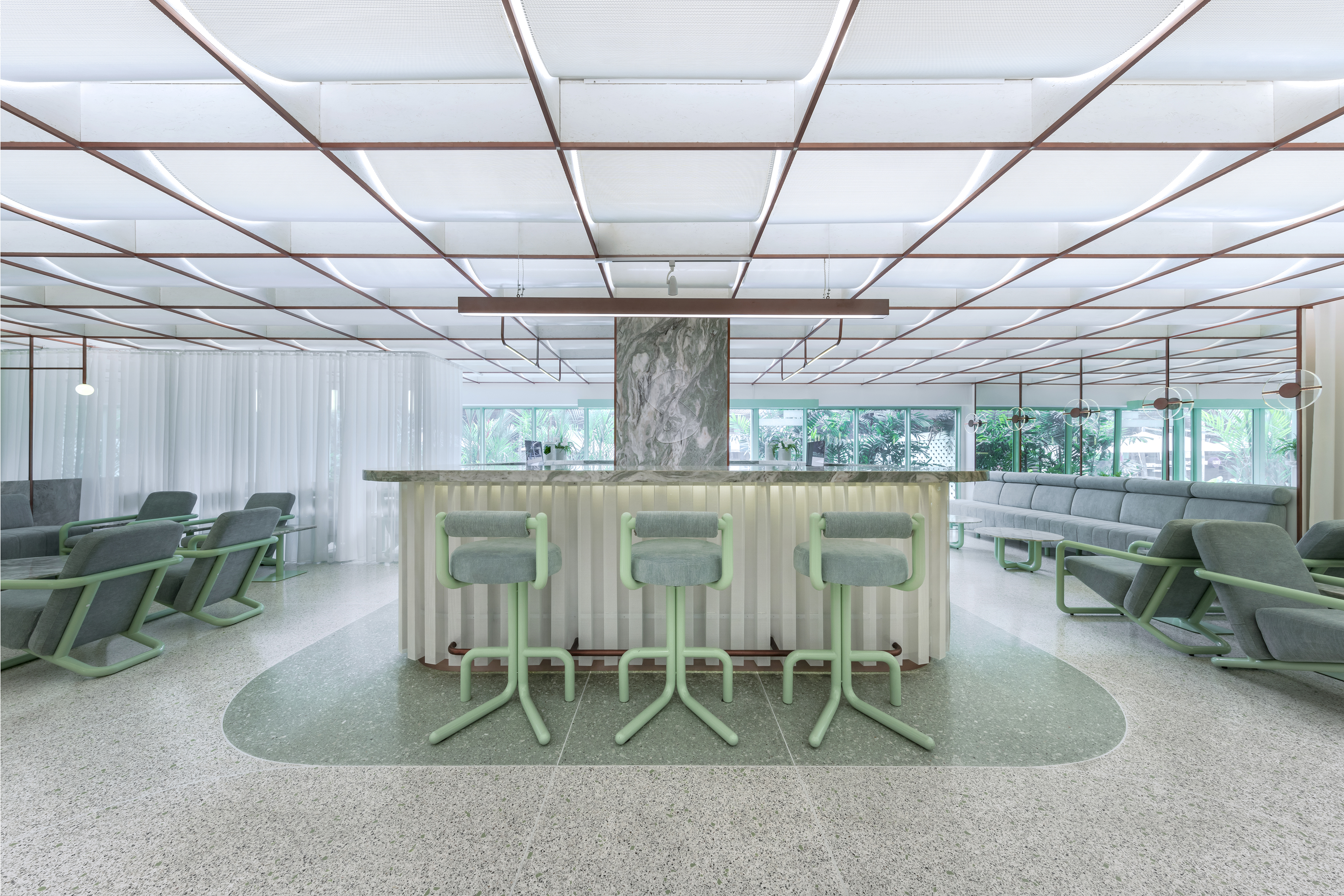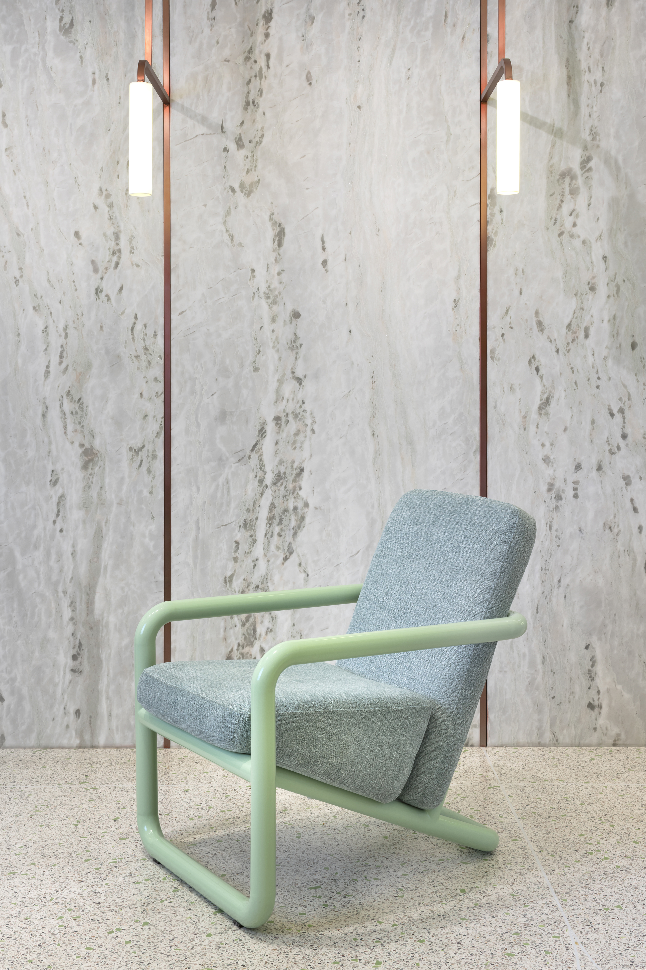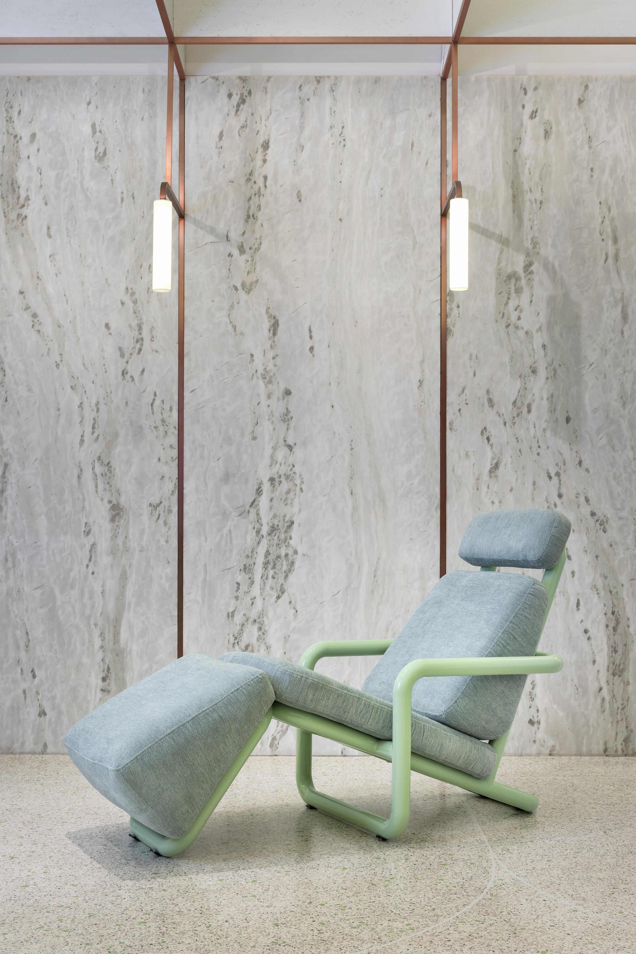 The furniture in the lobby is all part of Space Popular's latest collection, which features a lounge chair, a bar stool, a reclining chair with built in legrest, a side table, and a coffee table. All the pieces in the series are structured by mint green thick metal tubes combined with light petroleum blue upholstery. Together they construct an identity for the space while providing comfort in different forms.