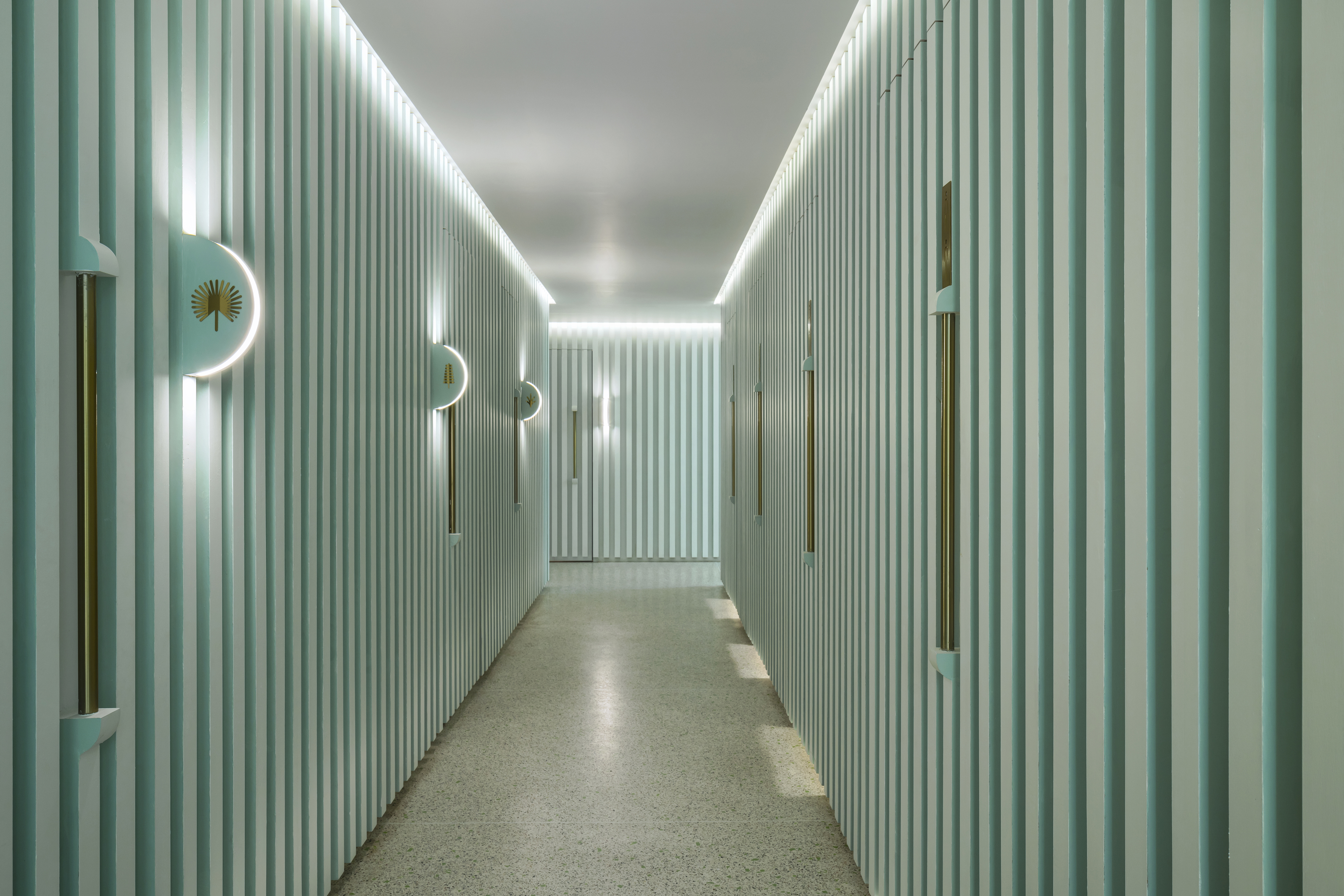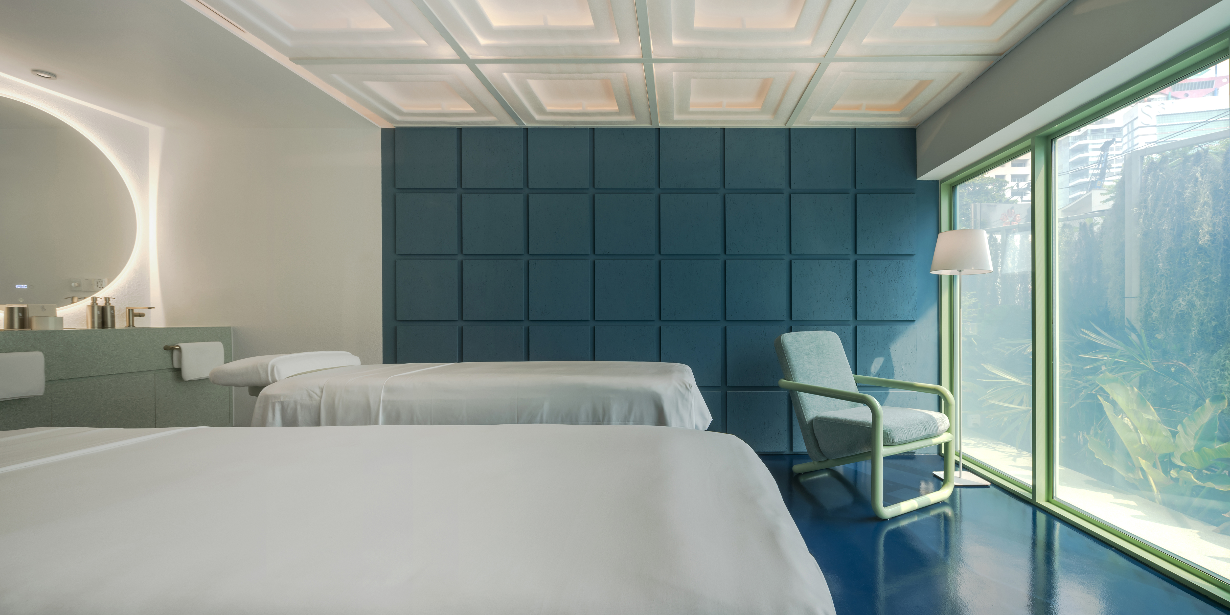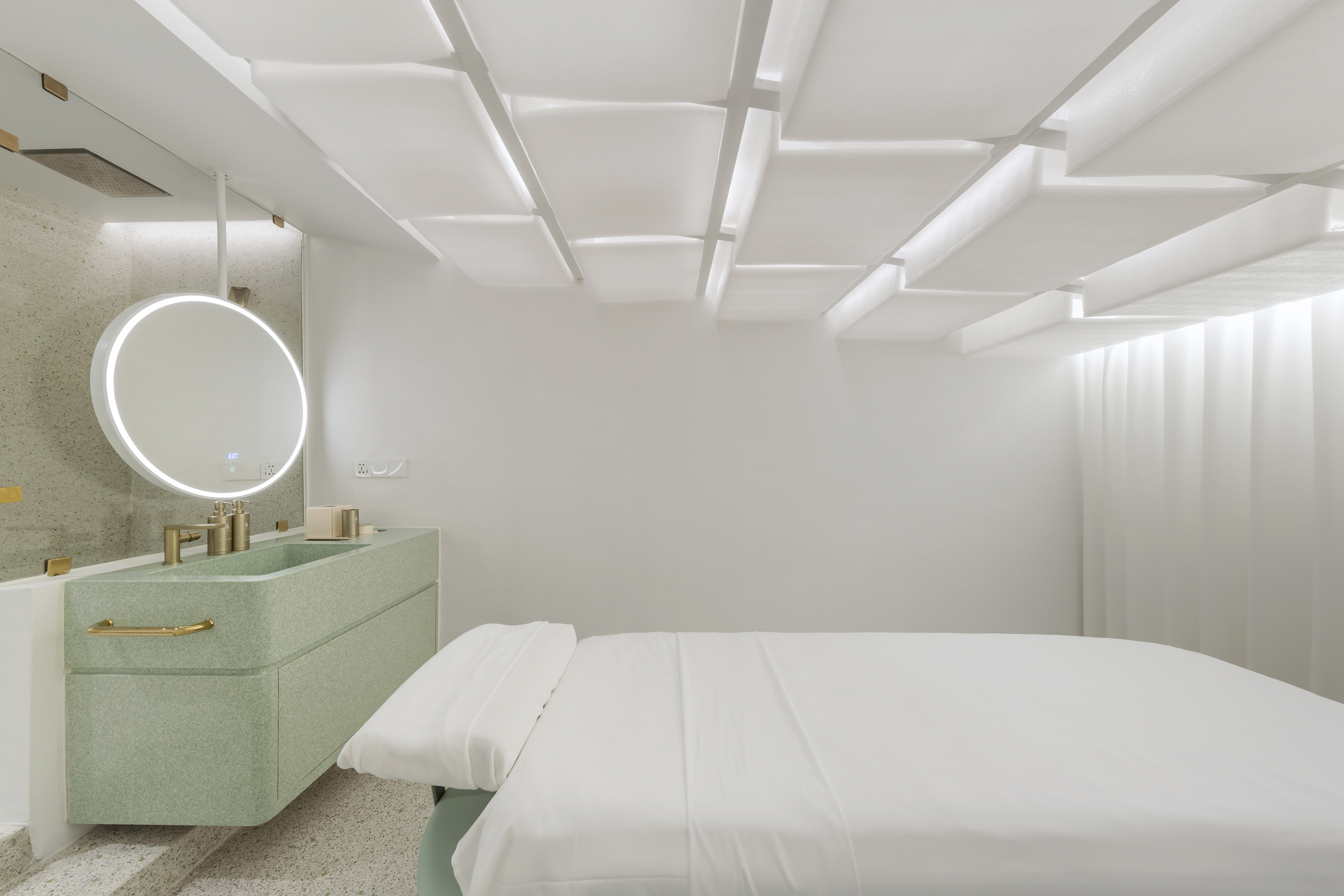 중앙 리셉션 공간과 5개의 개별 좌석 공간이 있는 공간은 3가지 유형의 치료실로 연결된다. 정원을 마주보고 있는 더블룸은 대조적인 재료를 통해 서로 다른 영역으로 구조화되어 있다. 스팀 샤워실과 화장실이 있는 젖은 영역은 옅은 분홍색 테라조와 질감이 있는 석고 표면으로 처리된 반면 마사지 및 라운지 영역은 벽에는 음향 패널이 있고 천장에는 포장 거품이 격자무늬로 되어 있는 어두운 파란색이다. 정원을 마주하지 않는 스위트룸은 그 자체로 분리된 공간이다. 질감이 있는 회반죽 지구라트 천장과 모래색 색상을 갖춘 이 방은 수백 층의 타워 아래 묻혀있어도 야외의 분위기를 연출할 수 있는 방이다. 싱글룸이 가장 밝으며 백라이트 커튼과 폼을 사용하여 작은 크기를 보완했다. 복도는 두 가지 색으로 칠해진 나무 지느러미로 덮여 있으며, 입구와 출구의 다른 톤을 보여준다.
