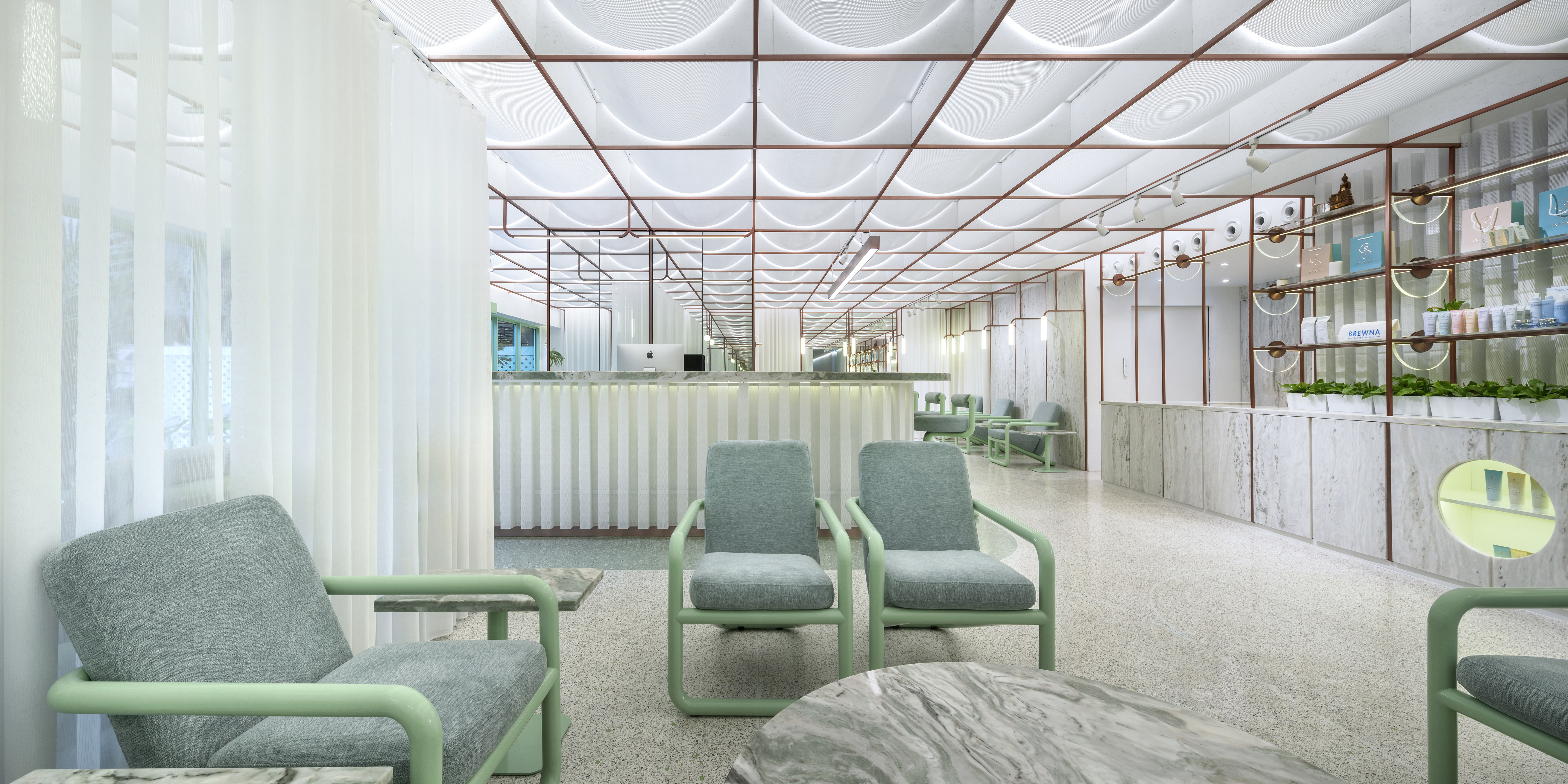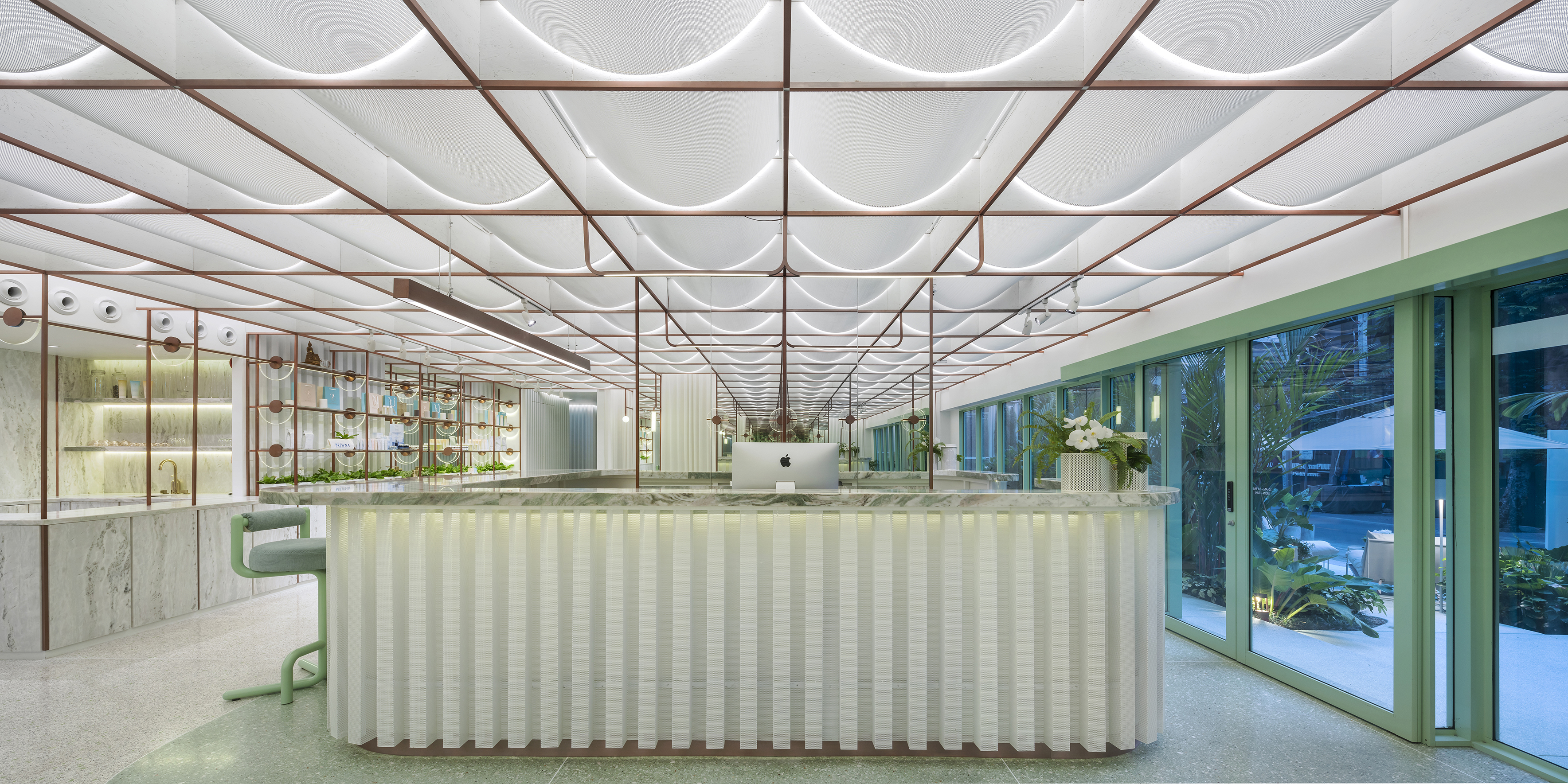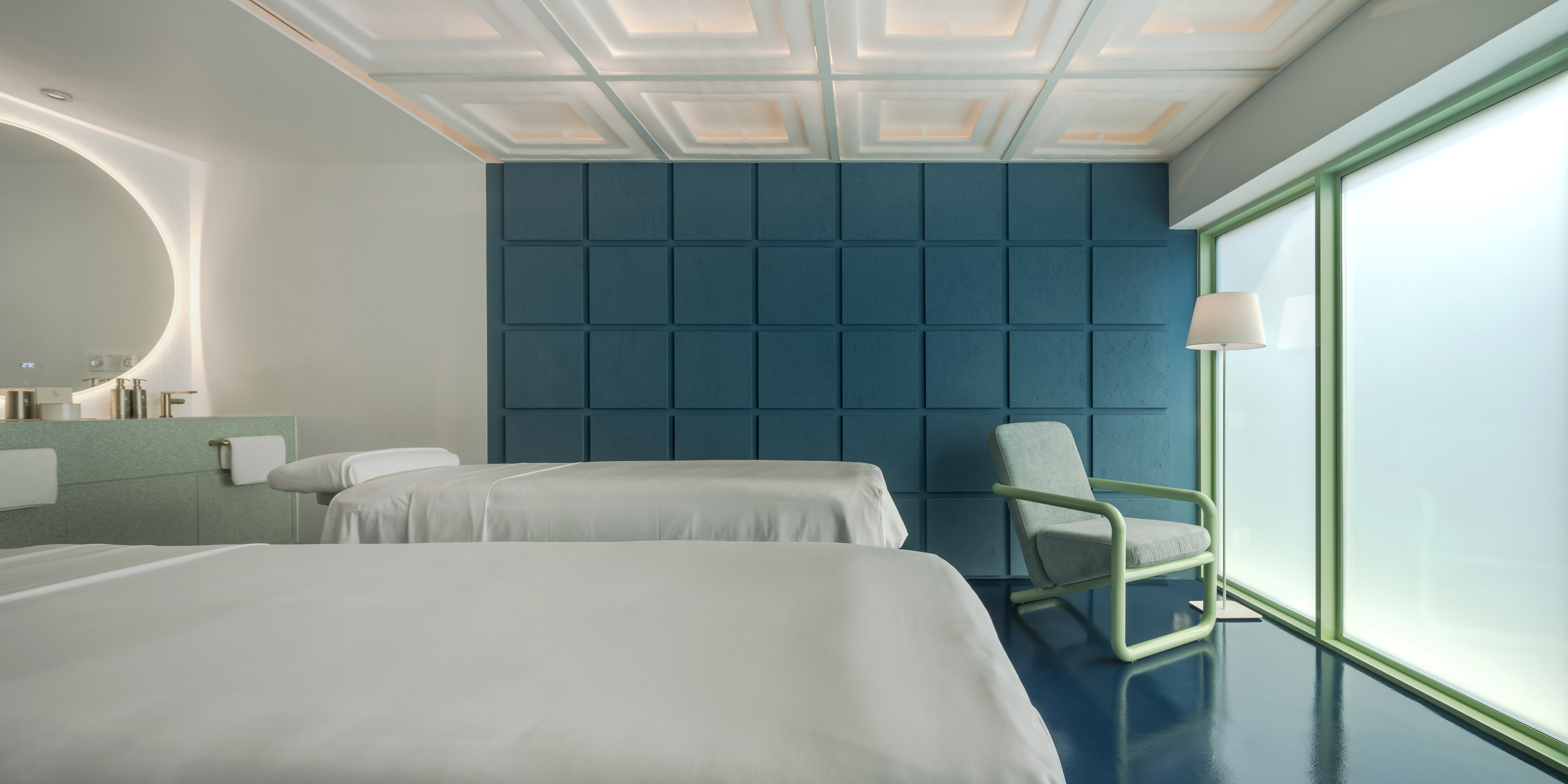 중앙 리셉션 공간과 5개의 개별 좌석 공간이 있는 공간은 3가지 유형의 치료실로 연결된다. 정원을 마주보고 있는 더블룸은 대조적인 재료를 통해 서로 다른 영역으로 구조화되어 있다. 스팀 샤워실과 화장실이 있는 젖은 영역은 옅은 분홍색 테라조와 질감이 있는 석고 표면으로 처리된 반면 마사지 및 라운지 영역은 벽에는 음향 패널이 있고 천장에는 포장 거품이 격자무늬로 되어 있는 어두운 파란색이다. 정원을 마주하지 않는 스위트룸은 그 자체로 분리된 공간이다. 질감이 있는 회반죽 지구라트 천장과 모래색 색상을 갖춘 이 방은 수백 층의 타워 아래 묻혀있어도 야외의 분위기를 연출할 수 있는 방이다. 싱글룸이 가장 밝으며 백라이트 커튼과 폼을 사용하여 작은 크기를 보완했다. 복도는 두 가지 색으로 칠해진 나무 지느러미로 덮여 있으며, 입구와 출구의 다른 톤을 보여준다.