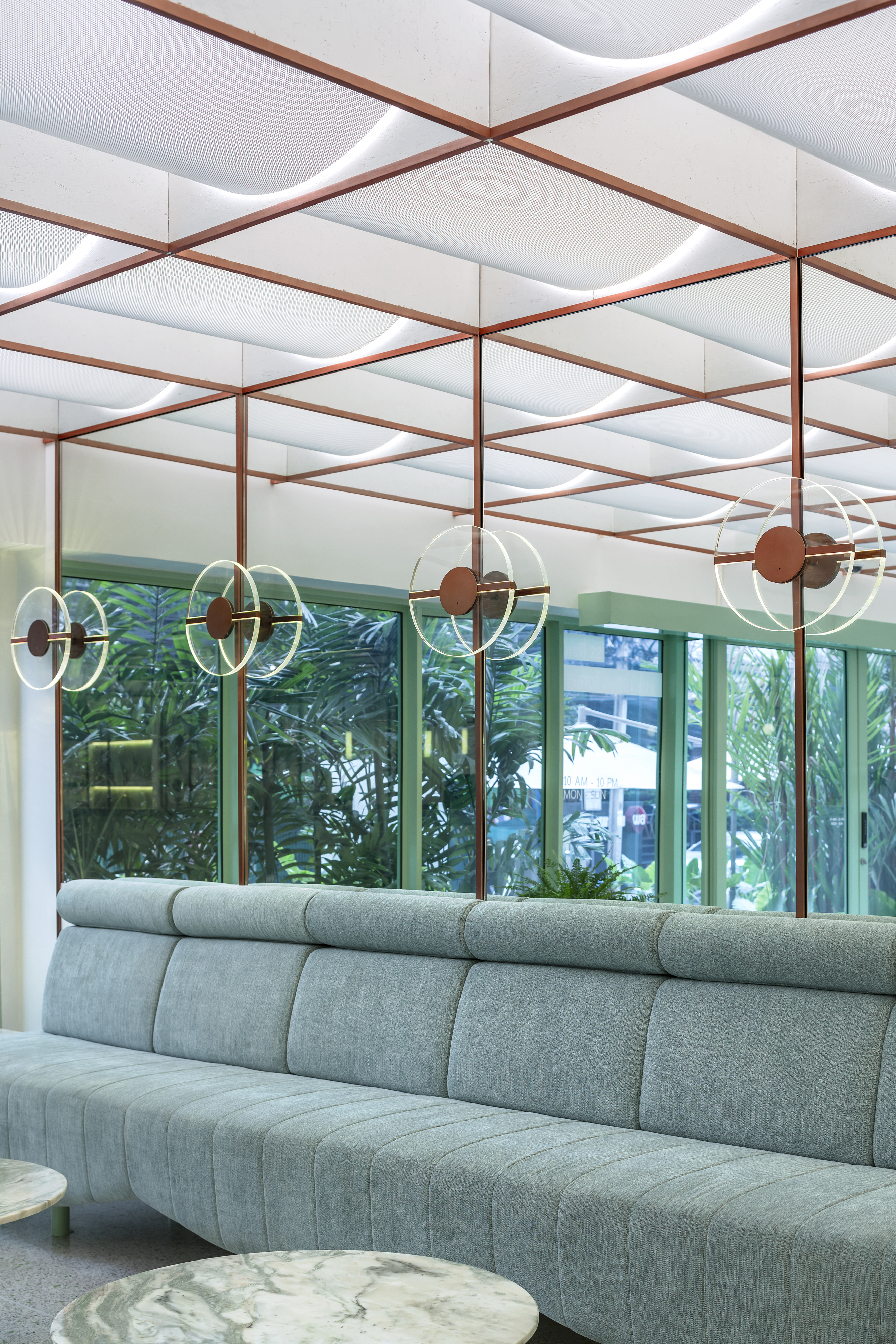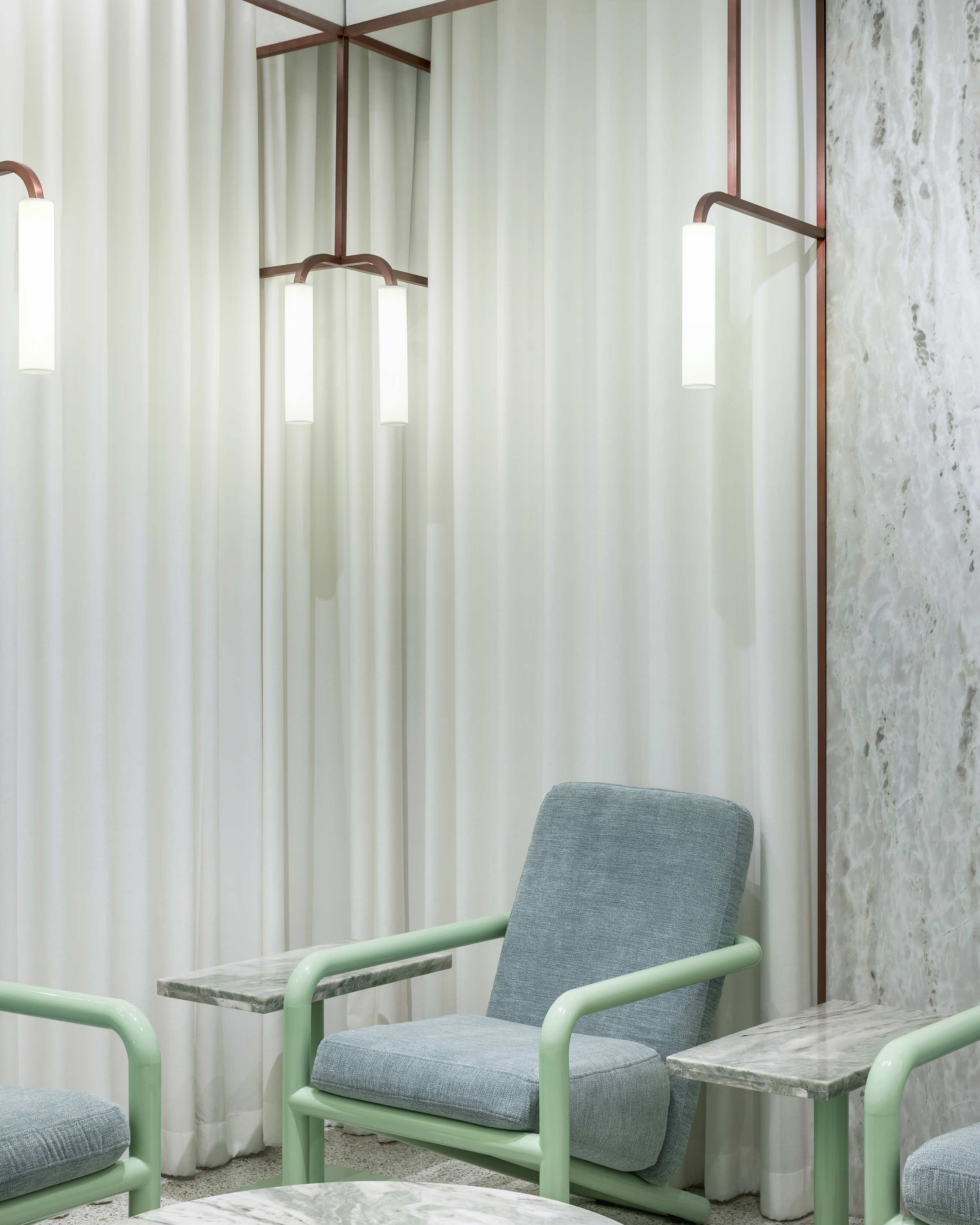 로비에 있는 가구는 모두 Space Popular의 최신 컬렉션의 일부로 라운지 의자, 바 스툴, 내장형 다리 받침대가 있는 안락의자, 사이드 테이블, 커피 테이블이 있다. 시리즈의 모든 부품은 민트 그린의 두꺼운 금속 튜브와 밝은 석유 블루 실내 장식으로 구성되어 있다. 서로 다른 형태로 편안함을 제공하면서 공간의 아이덴티티를 구성한다.