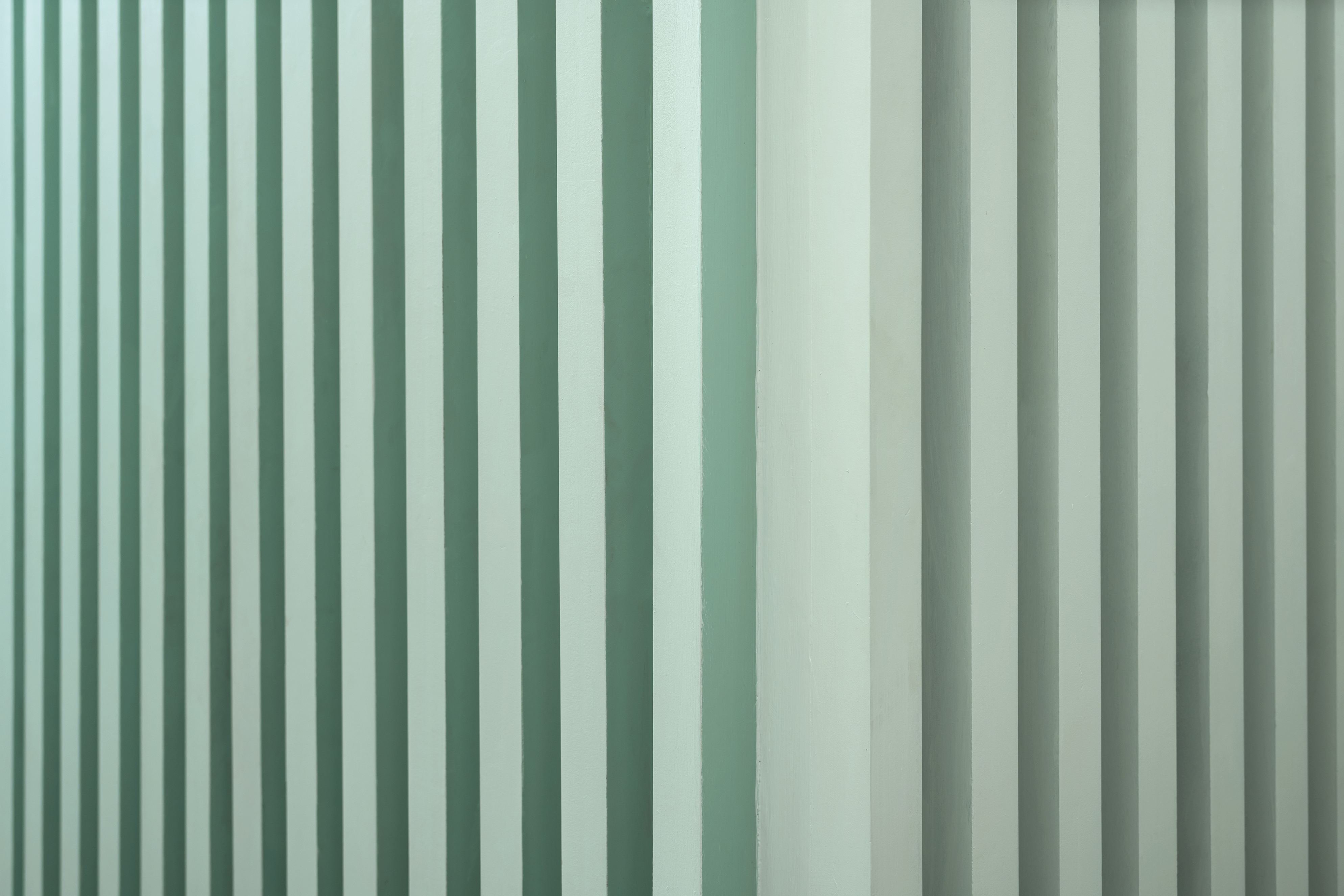 The arrival space with its central reception space and five distinct seating areas connects to three different types of treatment room. The suites. facing the garden, are double rooms structured into different areas through contrasting material: the wet area with steam shower and toilet is treated with pale pink terrazzo and textured plaster surfaces, while the massage and lounge areas are dark blue with acoustic panelling on the walls and a grid of packaging foam on the ceiling. The one suite that does not face the garden is its own separate world. With a textured plaster ziggurat ceiling and a sand tone palette, this room creates a sense of the outdoors even if it is buried under the hundreds of floors of the tower above. The single rooms are the brightest and in them the use of backlit curtains and foam compensates for their smaller size. The corridors are clad in wooden finns painted in two different colours, exposing a different tone on arrival and departure.