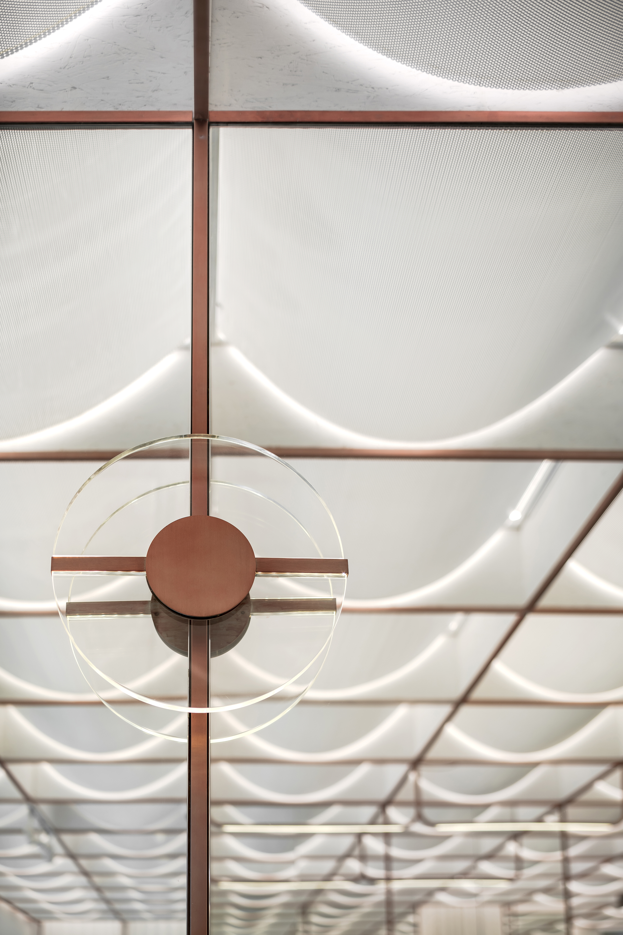 Through the leaves of the garden, the spa is in strong contrast to the street with its often chaotic collage of sounds and sights. Inside, materials are smooth, joints are precise, and space is deep. The arrival space which overlooks the garden introduces a calming palette dominated by white and pale green with elements of copper.