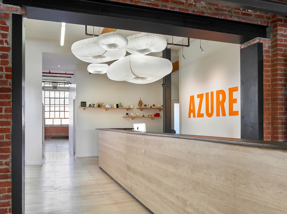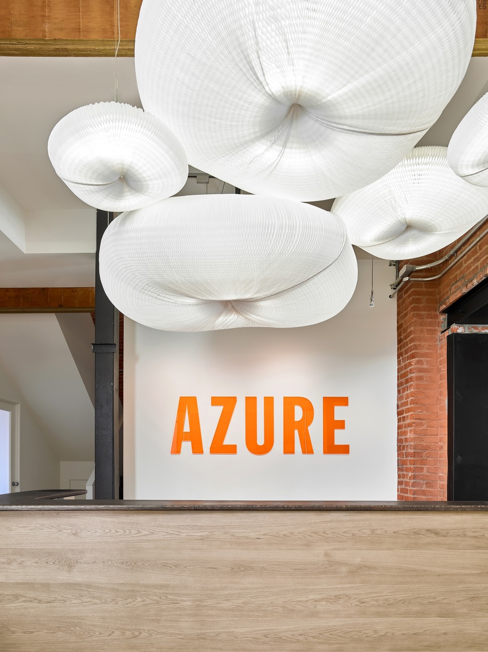 새롭게 떠오르는 이 창조적인 구역 내에서 Azure는 두개 층에 걸쳐 5,600평방 피트의 공간에 자리 잡고 있다. 입구는 사무실로 이어지는 긴 복도 끝 축에 있는 리셉션 유리를 통해 볼 수 있는 주황색 슈퍼 그래픽으로 렌더링 된 독특한 로고로 구분된다. 잡지에 일상적으로 등장하는 캐나다 디자이너들과 어울리는 머리 위의 기발한 펜던트는 확장 가능한 종이 기하학으로 가구와 조명 기구를 만드는 밴쿠버 기반 스튜디오 Molo에 의해 만들어졌다. 다섯 개의 펜던트가 구름처럼 모여 있고 리셉션 데스크 위에 떠 있다. 리셉션 데스크는 Sterling Road의 이웃이기도 한 주문형 가구 제조업체인 Brothers Dressler가 구불구불한 오가닉 원목으로 상판을 제작했다.