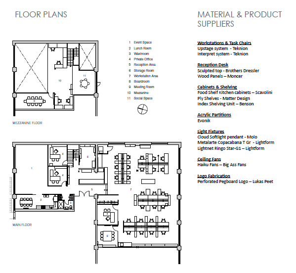 사무실의 재료들은 새로운 것과 오래된 것의 전략적 상호 작용으로, 전통적인 질감의 붉은 벽돌 벽, 오래된 나무 판자 천장, 새로 설치된 허니 블론드 단풍 바닥재, 어둡게 변한 거친 강철 기둥과 빔과 대조적으로 그래픽, 좌석 및 간판에 흰색과 팝적인 색상이 사용됐다.