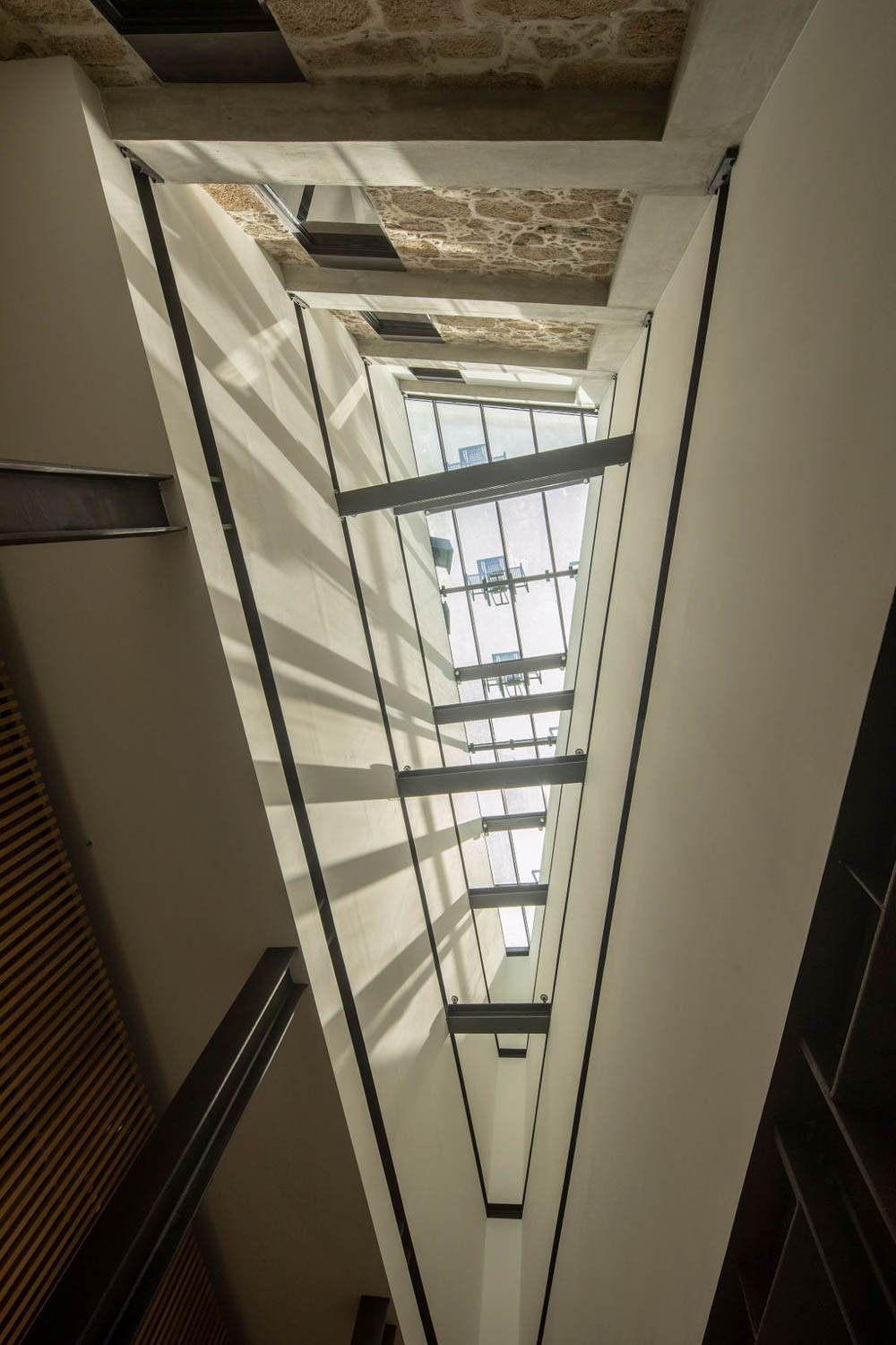 Innovation was another concern, we used transparent photovoltaic glass to make the roof of the old convent’s sixteenth-century church, which was totally in ruins. This transparency filtering part of the sun’s rays produces energy for the hotel in a clean and non-polluting way. On the other hand, the skylight provides dignity and mysticism as if it was a Romantic ruin.