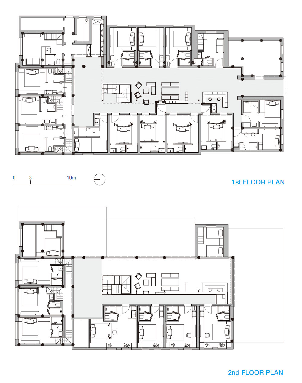 처음에는 기존의 장식을 철거할 계획이었지만 건축가는 공간의 풍부함과 시각적 특성을 높인 오래된 집의 세련된 목조 지붕 구조에 매료됐다. 13개의 객실이 촘촘하게 배치되어 있으며, 큰 지붕 아래의 안뜰은 관광객의 출입을 위한 핵심 공간이 된다. 비교적 내향적인 지역에 가벼운 계단이 배치되어 새로 추가된 2층을 안뜰과 더 쉽게 연결할 수 있다. 두 층 모두 손님을 위한 공공 활동 공간이며, 큰 지붕 아래는 독서, 담소 및 휴식을 취할 수 있는 공간이 조성됐고, 대화를 위한 작은 모퉁이 공간도 있다.
