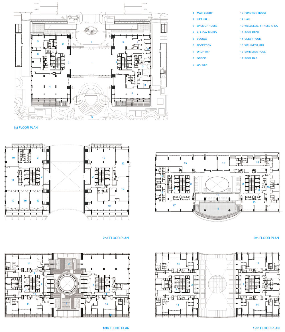 The top of the building is subtracted by a circle shape to make the interior atrium gain more natural light. Moreover, the mirror bowl-like shape panoramic view swimming pool and the other hotel facilities are located on the 9th floor, which is the middle of the building, so the guests can easily get access both from the low zone and high zone.