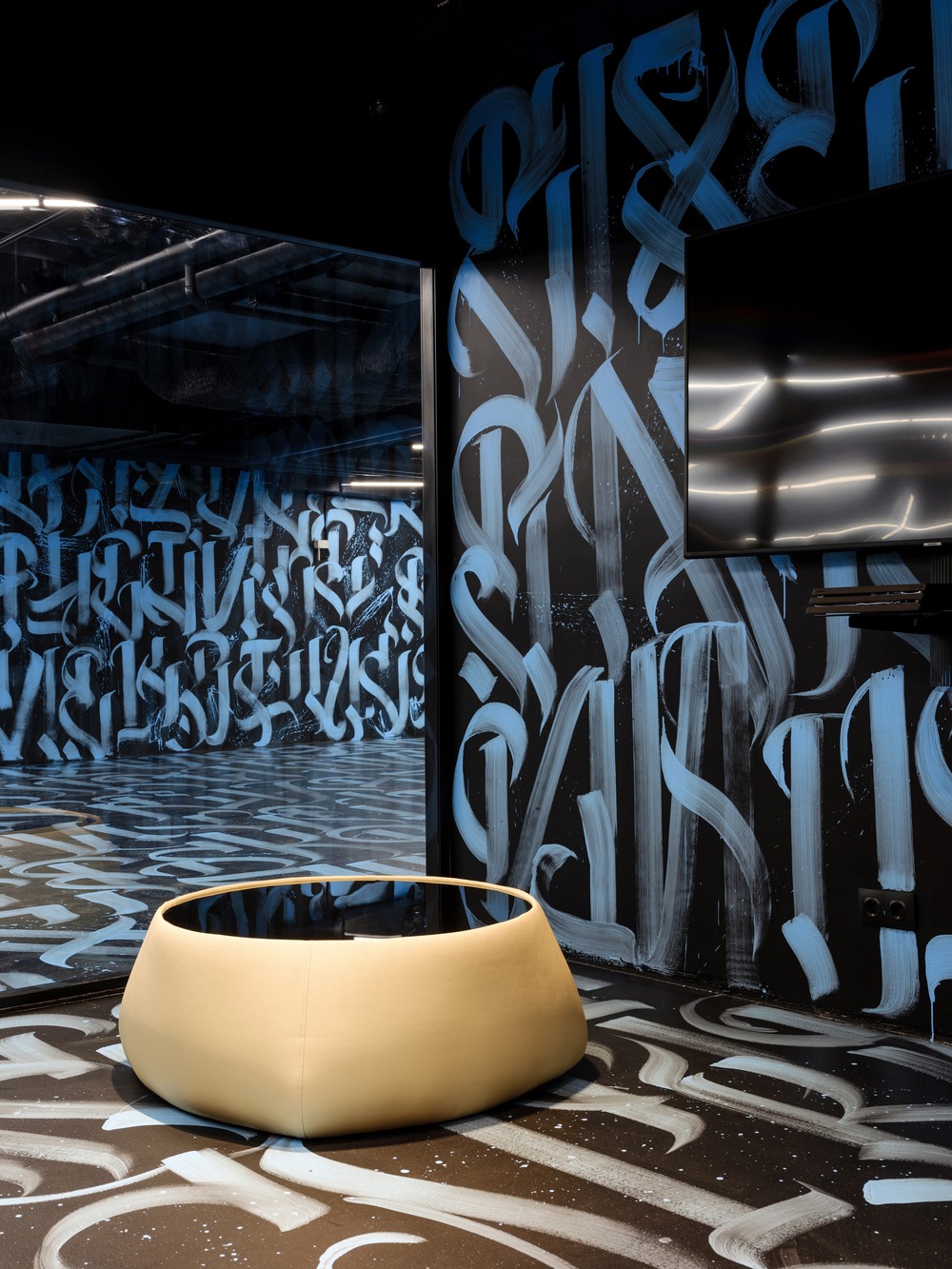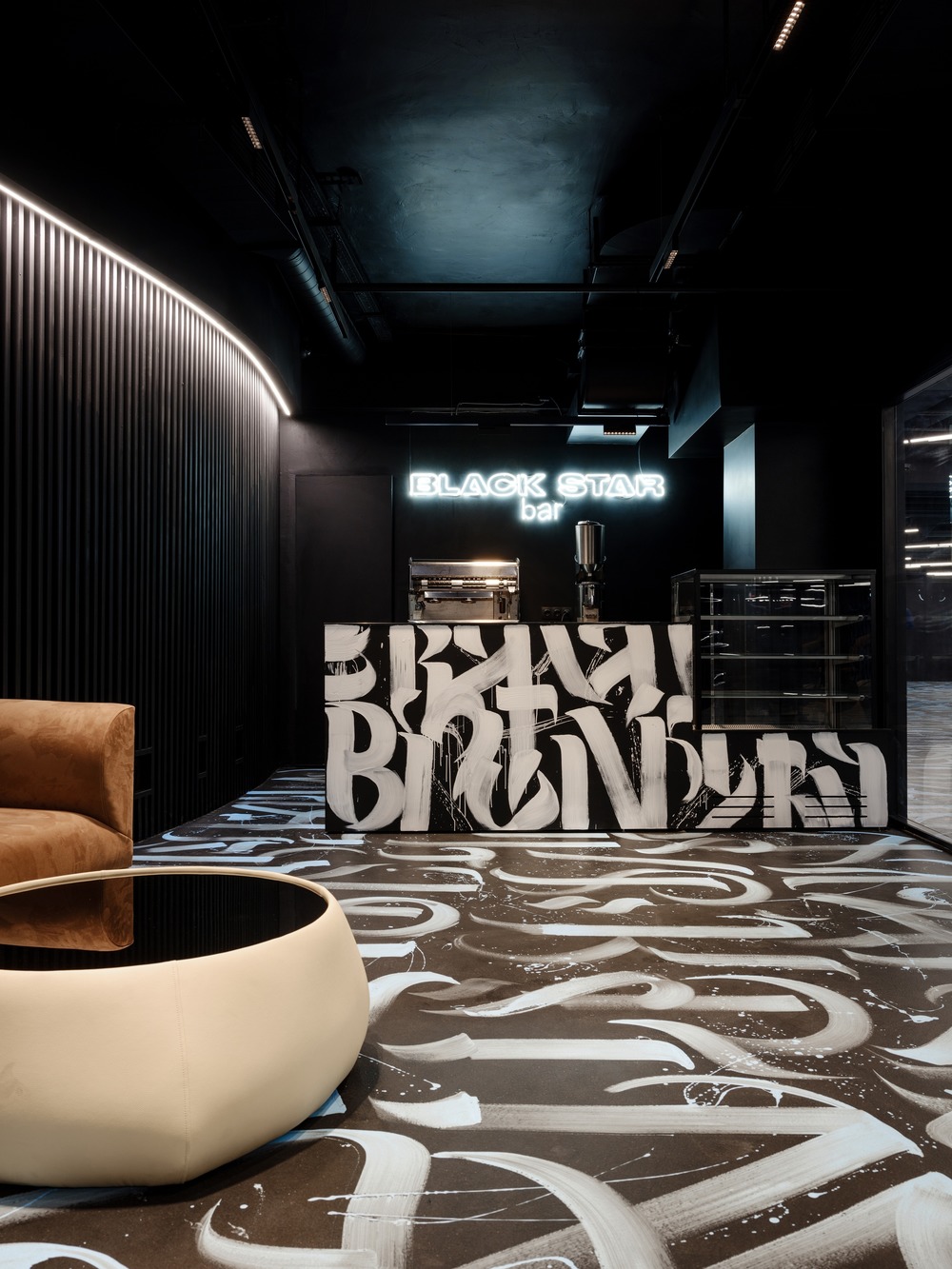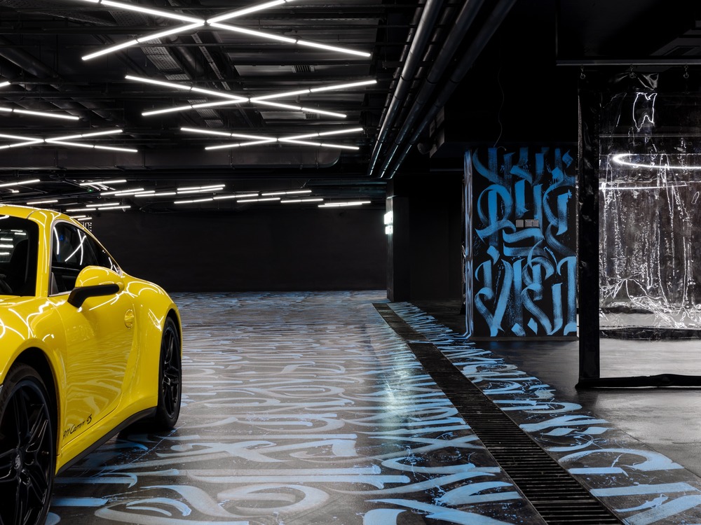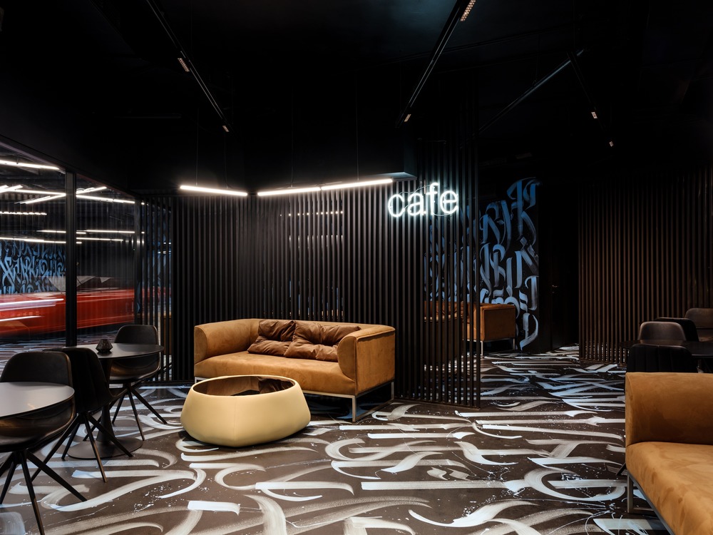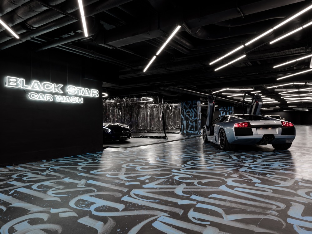The concept of the interior is a transformation and refraction of simple geometry of space by the shape of the pattern. The idea is performed by the combination of the dark graphite color, bright calligraphy composition, and light installations. Taking into account the facility function CARWASH and inspired by WYNWOOD in Miami, GRETAPROJECT created a special calligraphy pattern that consists of regularly repeated client’s label name BLACK STAR. Graphic and at the same time geometric pattern creates a memorable setting and expands enclosed space visually.