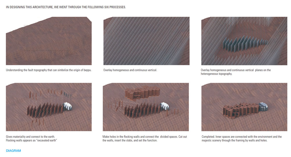 Beppu’s most valuable resource is hot spring, and its origins can be traced back to the orogeny. We wanted to realize a new characteristic architecture of the region by starting to think about the design from the unique terrain of this area that was born in the geological time. Assuming walls carved from the ground of a fault scarp, holes were made in the flocking walls like digging a cave to create space where one space and another space or the inside and the outside are connected.