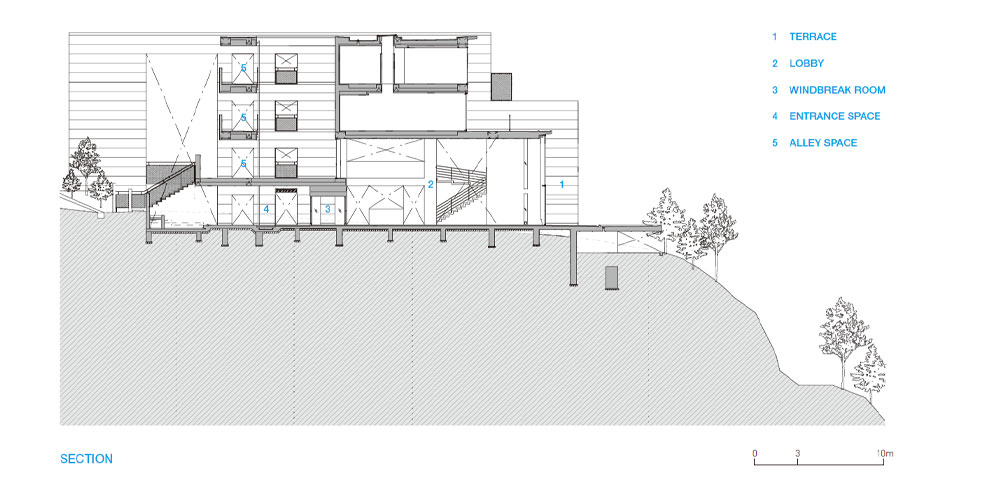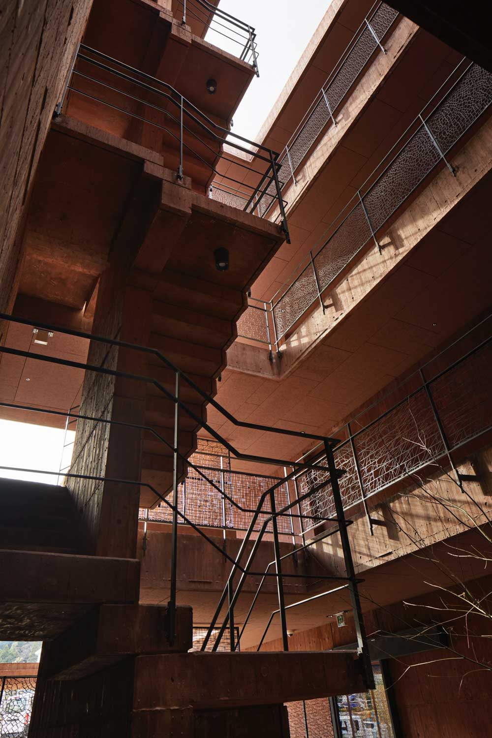 This hotel has 33 general guest rooms, 2 duplex suites, a lobby, a cafe & bar, a multipurpose studio and terrace spaces. They are connected by semi-outdoor “alley space” where the vertical and horizontal axes intersect intricately. In walking around, you will be connected to the framed landscape through holes in the walls and feel the lights and sounds that permeate. It is a spatial experience reminiscent of geological time, and it overlaps with an experience of walking around the alleys of old downtown of Beppu.