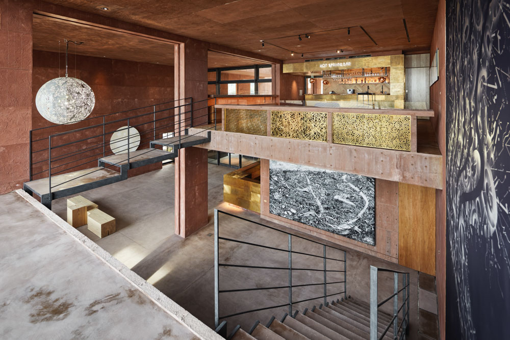 걸어다니다 보면 벽에 뚫린 구멍을 통해 프레임 속 풍경과 연결되고, 그 사이로 스며드는 빛과 소리를 느낄 수 있다. 지질시대에서 영감을 받아 디자인된 공간 체험으로 벳푸 구도심 골목길을 연상케 한다. 건축물 전체적으로 사용된 외장재는 현지에서 생산된 삼나무 숲으로 만들어진 특수 거푸집 안에 산화철을 입힌 콘크리트 톤을 입혀 만들어졌다. 외장재의 이런 산화철은 땅의 지층과 돌의 색을 띠고 있어, 주변 풍경 속으로 녹아들게 만든다. 백화, 요철, 쪼개짐 등이 자연스럽게 나타나, 이 건축물만의 특징을 보여준다. 목재나 미장재와 같은 재료는 가능한 가까운 지역에서 조달됐으며, 금속은 온천과 반응하여 마감됐다. 독특한 분위기의 건축물과 지역색이 담긴 재료들로 갤러리아 미도바루 호텔에 가지 않고는 경험할 수 없는 특별한 가치를 만들어낸 건축가의 안목이 돋보이는 작품이다.
