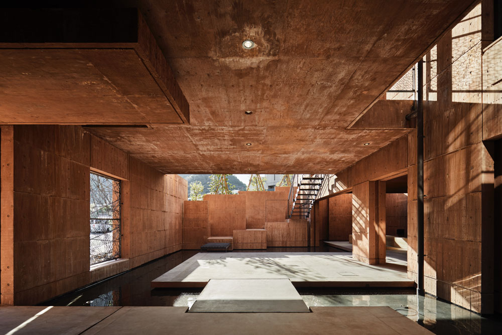 The flocking walls were made by placing concrete toned with iron oxide in a special formwork made of locally produced cedar woods. The color tone was adjusted by referring to the strata and stones of the land. Phenomena such as efflorescence, unevenness, and chipping of joints was positively accepted as the expression. Materials such as woods and plasterer were chosen from as near as possible area. The metal was finished by reacting with the hot spring. By devising how to make architecture and selecting materials, we tried to create value that could not be experienced without going there.