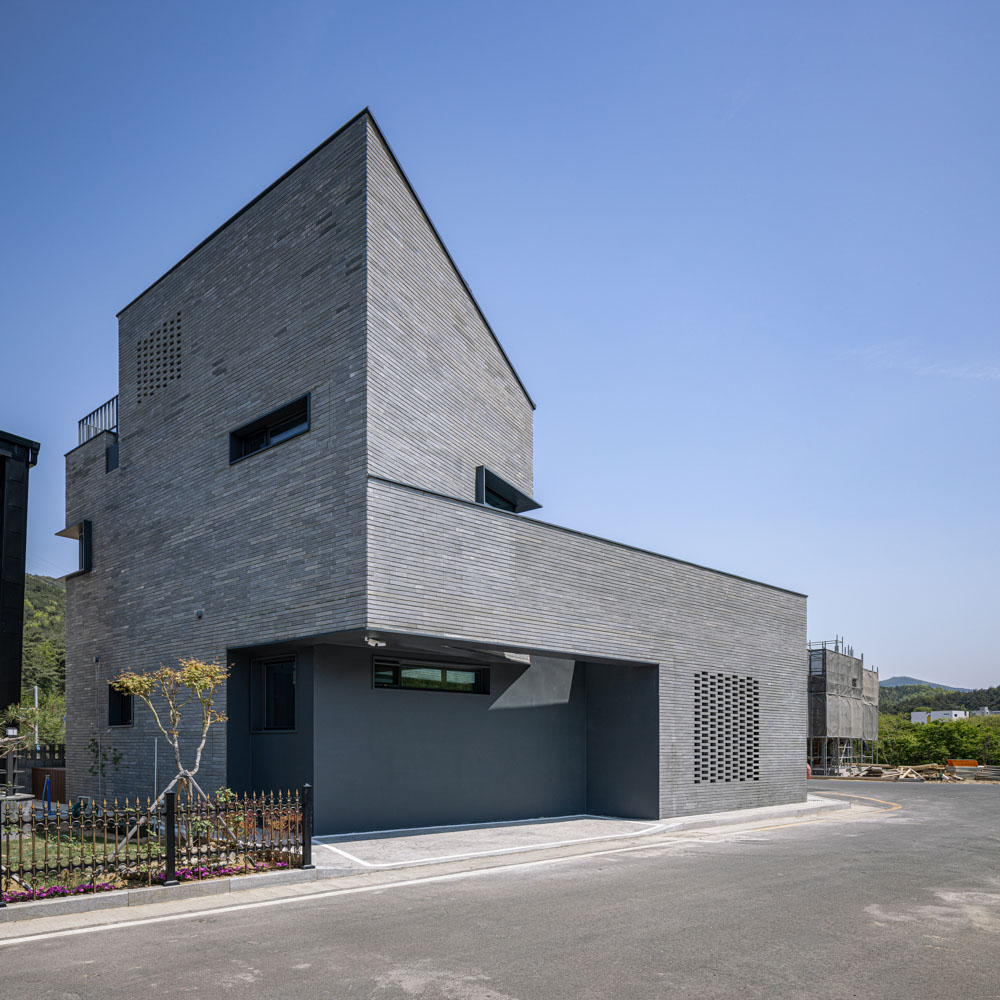 The Edge House has unique features seen at the southern entrance of the complex as one enters the detached house site. The house has a river view on the south side of the site, and has a courtyard inside, so it feels closed, but it is a cozy and open space for families. The space is located along the corner road to protect the courtyard, and the wide deck that opens to the southeast on the second floor ensures a dramatic sense of openness and a constant amount of sunlight. The shape of the roof was determined according to the district unit planning guidelines, but considering the locational characteristics of the house built on two sides of the road, the architect’s efforts to create it to look like a new and colorful space every time it is viewed from a different angle can be seen. Inside, it is a house for five family members, a married couple and three children, but you can see that it was remodeled with drywall in mind so that it can be used as a variable space if the children leave home in the future.