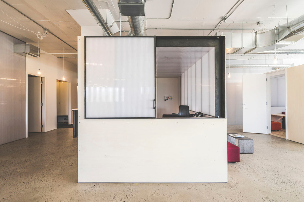 바로 중앙에는 4명의 창립자들을 위한 각각 4개의 반개방형 부스가 있는데, 이것은 마치 테이크 아웃 판매대를 연상시킨다. 현지의 포플러 합판과 반투명 폴리카보네이트로 만들어진 그것들은 많은 자연광을 들여보낸다. 이 소형 마이크로 오피스에는 통합된 작업 데스크와 개인 1:1을 위한 단풍나무로 만들 작은 좌식 테이블이 있다. 커다란 피벗 창을 통해 팀원들은 잠시 들러서 작업을 할 수 있다.