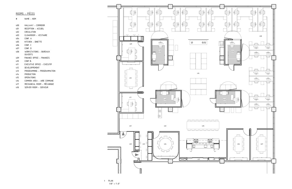 네 개의 임원 사무실 사이와 워크스테이션에서 멀리 떨어져 있는 베키아 모듈식 좌석 시스템과 낮은 철제 테이블은 몬트리올 Perez Furniture의 가구로 사람들이 모일 수 있는 편안한 장소 역할을 한다. 셀 수 없이 많은 구성으로, 그 공간은 친근한 잡담, 팀 회의, 그룹 교육, 상영, 회의, 칵테일 리셉션을 포함한 모든 종류의 활동에 적합하다. 비록 뒤쪽으로 물러나 있지만, 이러한 보다 개별적인 활동은 여전히 공개적이다. 비밀회의를 위해 방문자와 직원은 다양한 설정이 있는 여러 개의 폐쇄형 방을 사용할 수 있다.