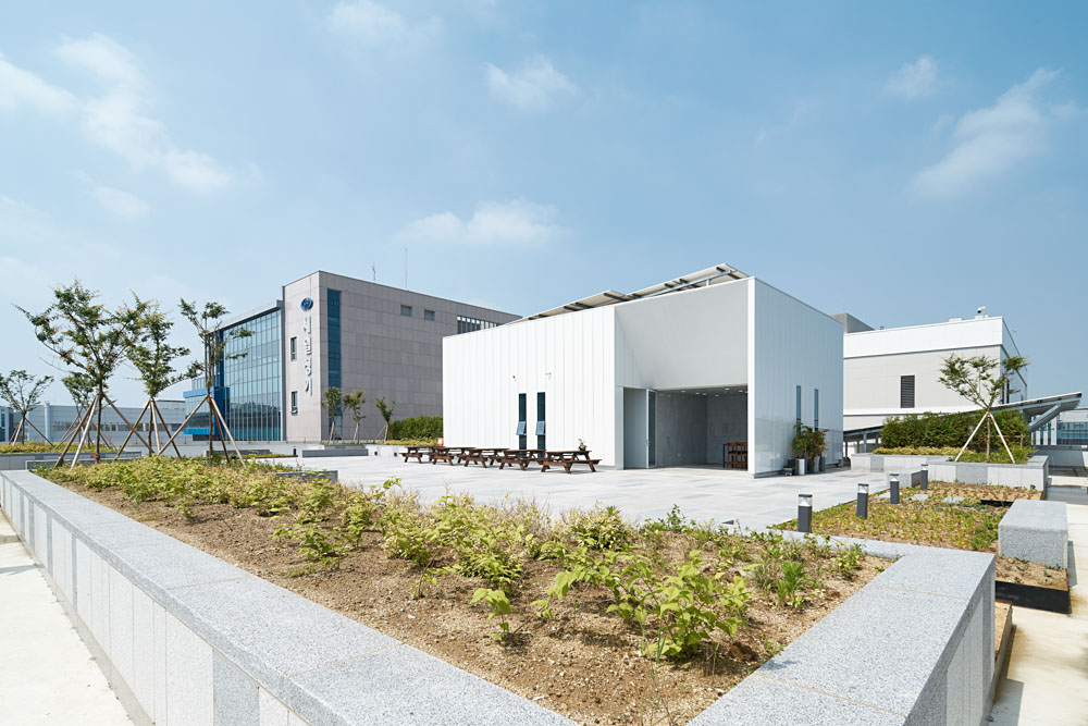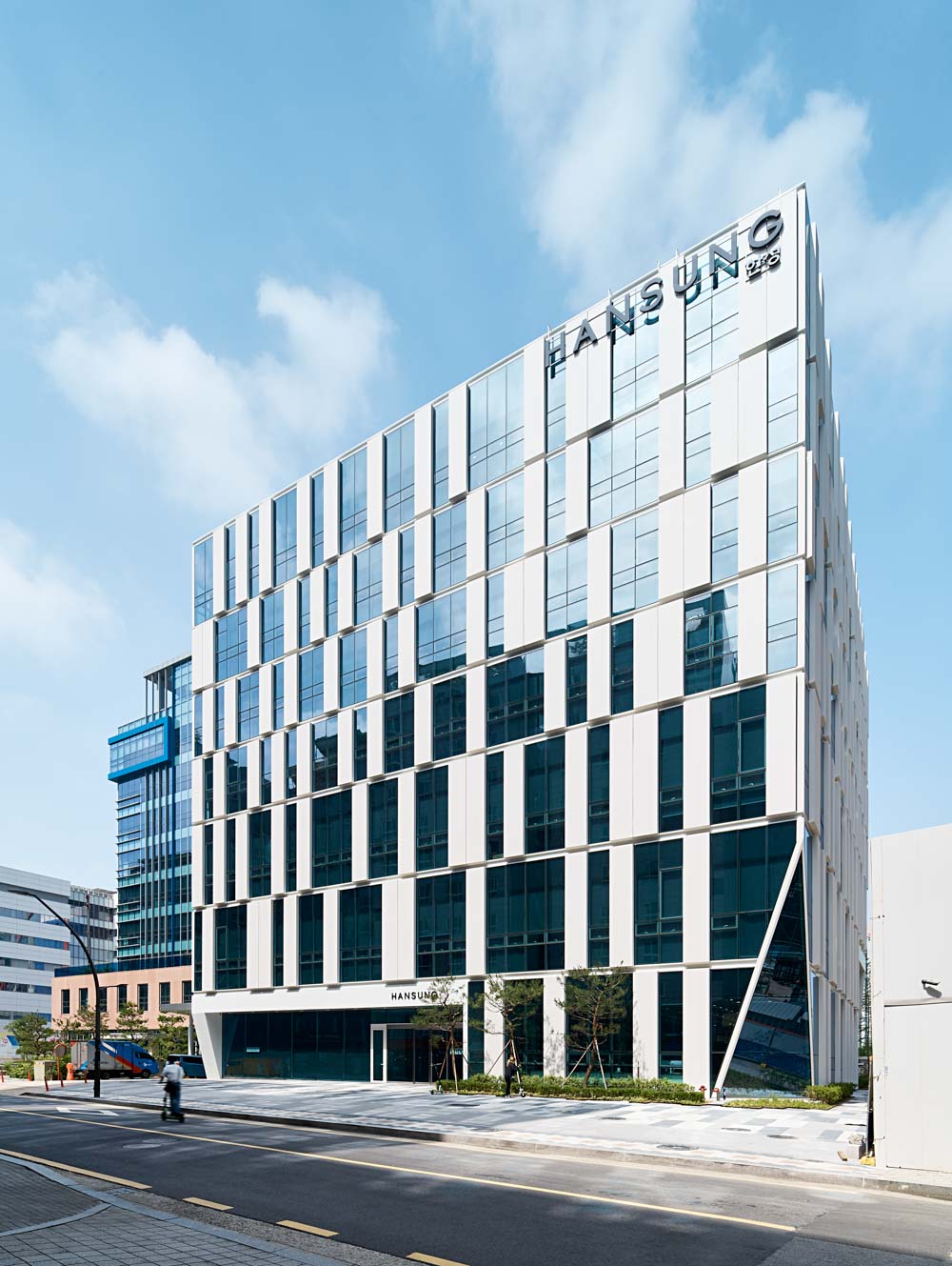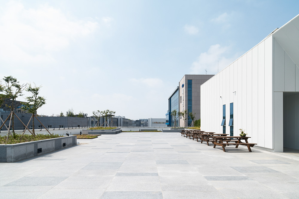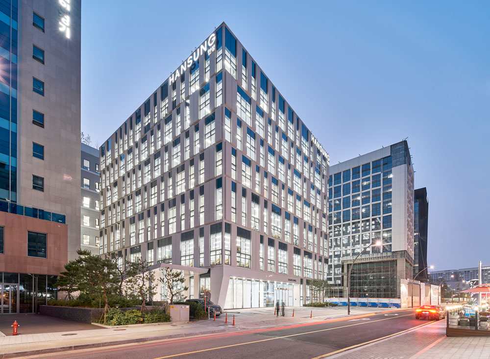 In the design, the perspective of “cost-effectiveness” of Hansung Co., Ltd., is applied in various places. The maximum area, minimum cost, and effective design were achieved. The cube-like shape for maximum volume represents a solid and robust corporate image, and the harmonious entrance of the lower slanted line contains the direction of a future-oriented company that changes with the times.