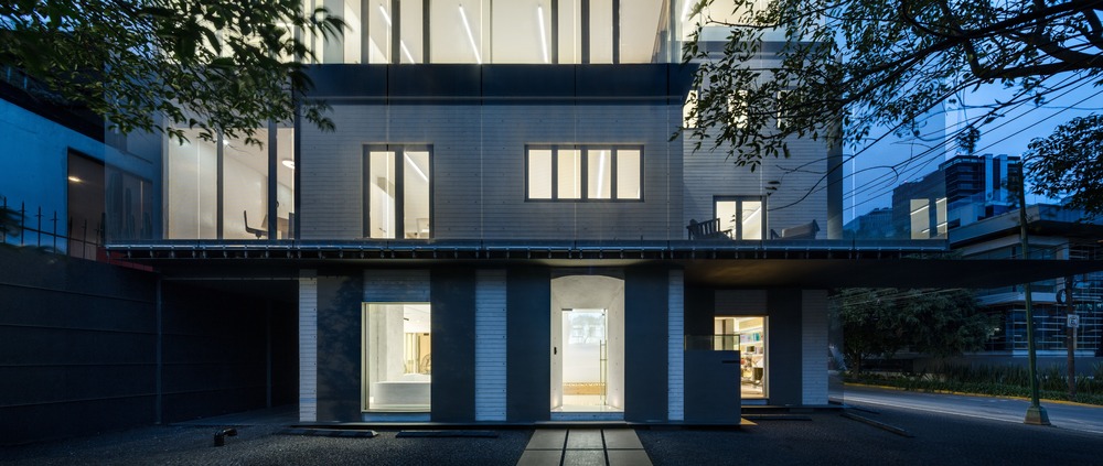 To consider the heritage value of the house was the guideline for their design process. They respected the proportions, openings, access and volume preserving its original essence, achieving harmony between the pre-existing space and their intervention. Three metal-plate roofs refer to the proportions of the house below, and a metal mesh, tensioned between these roofs, give the building its discrete, clean and elegant look, while at night time, the lighting reveals its more complex characteristic—its history. Inside, at every level, a selection of different pieces of art is concerned with the fact that ARCHTONIC want their workspace to exhibit the talent of several artists, especifically Mexican. In the first level and upper levels they created terraces for the coexistence and recreation of their team. These areas are used daily to eat, live and work in open spaces overlooking the city.