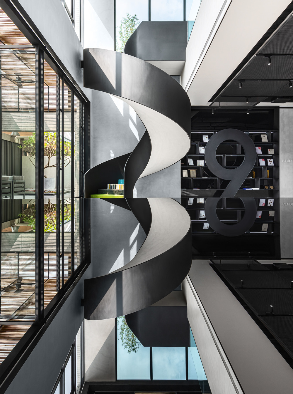 검은색의 철재 패널은 곡선형 단위를 형성하고 기하학적 형태의 층은 워터바, 안내데스크, 긴 식탁의 유기적 형태처럼 왜곡되고 분할된다. 2층의 업무용 책상은 목재 조인트와 강철 패널을 결합하여 만들어졌다. 그 구조는 가볍지만 동시에 무거워 보이는 나비처럼 보인다. 대칭 모양은 워크플로우의 원활한 순환을 용이하게 한다.