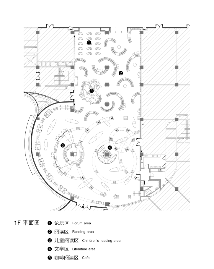 중앙의 문학영역에서 디자이너는 거울 천장을 사용하여 시각적으로 공간 연성을 확장하고 개방감을 만들었다. 두장옌 댐에서 영감을 받은 책장 벽은 역사문화가 쌓인 도성의 벽처럼 위로 펼쳐져 책의 기능적 운반체 역할을 한다. 검은 타일 바닥의 효과로 책상은 호수에 조용히 정박해 있는 배처럼 보인다. 공간은 시각적인 즐거움을 선사한다. 산책로를 따라 구조에 대한 건축적 변화는 비, 바람, 안개 등 기후 변화의 역동적인 미학을 반영한다. 두장옌의 숨 막히는 풍경이 공간에 생생하게 표현된다. 책장 벽의 문구멍을 통해 다양한 기능 영역이 모두 시야에 들어오며 독자의 시각적 경험을 풍부하게 한다. 마음에 드는 책을 들고 편안한 카페에서 예술에서 영감을 받은 부드러운 분위기의 조용한 공간에서 커피 한 잔을 즐길 수 있다. 오랜 시간 머물든 짧은 방문을 하든 독자에게 가치를 창출하고 이념적 영감에 도움이 되는 매우 장식적인 공간을 제공하는 Zhongshuge의 독특한 영적 핵심을 감상하게 될 것이다.