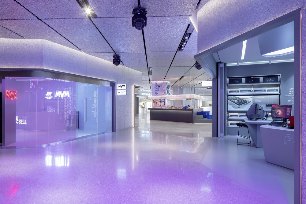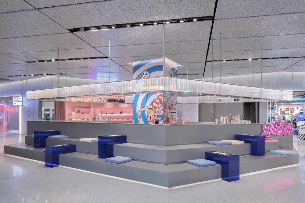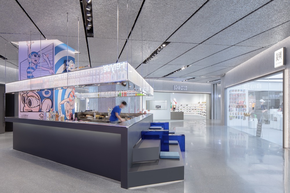 The aluminum paneling was of particular importance as the team had the idea of creating a grey-only mall surface. This created an interesting frame for each shop so that the colorful vendors and products would have a higher focus by the consumer. The aluminum material itself is air-blown and sourced from Canada, the same light-yet-sturdy material used in airplanes. The flooring is laid out in a terrazzo style while light slots were installed in the ceiling. Illuminated and colorful LED screens are also used to pop out from these neutral backgrounds and attract the eye to certain focal points, such as the retail stores and the DJ table.