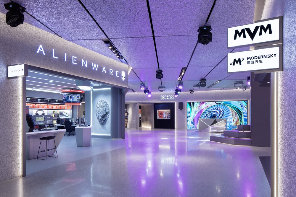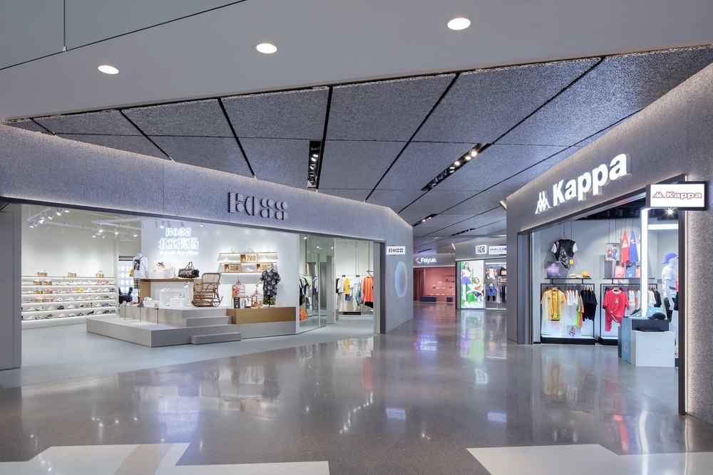 알루미늄 패널은 회색 전용 쇼핑몰 표면을 만드는 아이디어를 가지고 있었기 때문에 특히 중요했다. 이것은 각 상점에 흥미로운 프레임을 만들어 다채로운 판매공간과판매 공간과 제품들이 소비자에게 더 높은 초점을 맞출 수 있도록 했다. 알루미늄 소재 자체는 비행기에 사용되는 가벼우면서도 견고한 소재로 캐나다에서 공급됐다. 바닥은 테라조 스타일로, 천장에는 라이트 슬롯을 설치했다. 조명과 다채로운 LED 스크린도 이러한 중립적인 배경에서 튀어나와 판매 공간과 DJ 테이블과 같은 특정 공간으로 시선을 끌어들이는 데 사용된다.