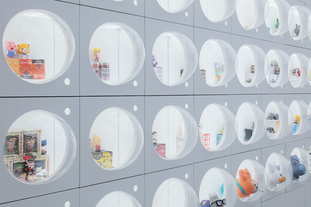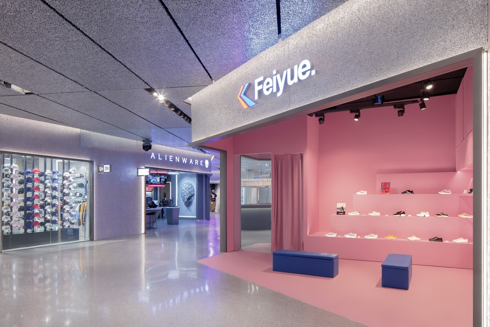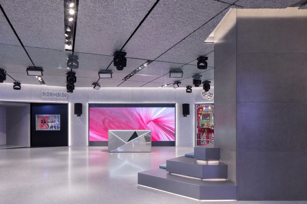 라이브 이벤트 공간 외에도 건축가는 기간 한정 구매가 가능한 팝업 상점도 디자인했다. 화이트 톤에 로즈 핑크 스플래쉬를 사용하여 대비가 높은 매장을 만들었다. 양각과 음각으로 접힌 벽은 그 안에 포함된 제품을 보여주기 위해 사용됐다.