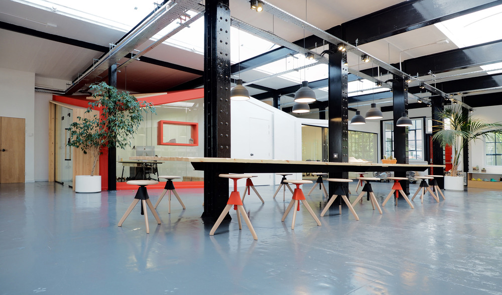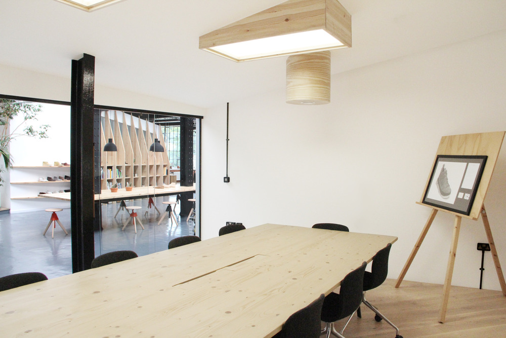 The main idea for this workplace is to encourage creativity and optimize exchanges between the designers, developers and product managers of the Clarks Originals team - while addressing the challenges and respecting the flow of the footwear design process. Part of the historical industrial C&J Clarks site built in 1825, this space used to be the tools plant for the shoe manufacture. The Arro project splits the space into 5 different zones, each defining a specific function, yet blending one into the other. Acting as a key element of the workplace, an 8-meter long floating table built around the existing INP beams creates a focal point for the team members to gather and connect. The 'Modern factory' embodies Arro's reinterpretation of the historical C&J Clarks surrounding buildings striking features (triangular roof tops of the old shoe factory, central brick chimney). Enclosing 3 rooms, the 'Modern factory' encompasses the director’s office, a storage room and a large meeting room.