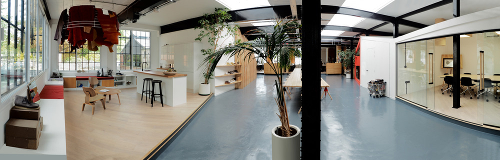 개방형 작업 공간은 이 산업부지의 크고 독창적인 창 덕분에 탁월한 자연 채광의 이점을 얻는다. 여행용 트롤리를 사용하여 기존 INP 천장 빔에서 회전하고 미끄러질 수 있는 대형 코르크 패널을 만들었다. 이 다용도 작업 환경을 통해 직원들은 필요에 따라 자신의 공간을 닫거나 열어 둘 수 있다. 작업 공간의 한쪽 끝에는 기능적인 '신발 벽'을 만들었다. 신발 디자인을 전시하는 데 사용되는 각 선반은 벽을 열고 거대한 벽장으로 바꾸는 손잡이 역할을 한다. 따라서 신발 보관 용량을 극대화하고 다양한 샘플과 테스트의 구성을 최대한 간단하고 논리적으로 유지한다. 마지막으로 폐쇄된 시설로 만들어진 가죽 보관소는 선반이 작업 공간으로 연속성을 유도하고 떠 있는 중앙 테이블이 있는 라이브러리로 둘러싸여 있다. 이 벽의 일부는 반투명 유리 패널로 만들어졌다. 이는 특정 조명 시스템 덕분에 전시된 가죽 롤의 다양성과 특성을 드러내고 강조한다. 영감과 휴식을 위한 공간인 라운지 공간은 가죽 수납장 반대편에 있다. 큰 창문으로 둘러싸인 라운지는 작은 주방, 바, 구석에 있는 대형 수납 벤치 시스템, 이 프로젝트를 위해 건축가가 특별히 설계한 조명이 있다.