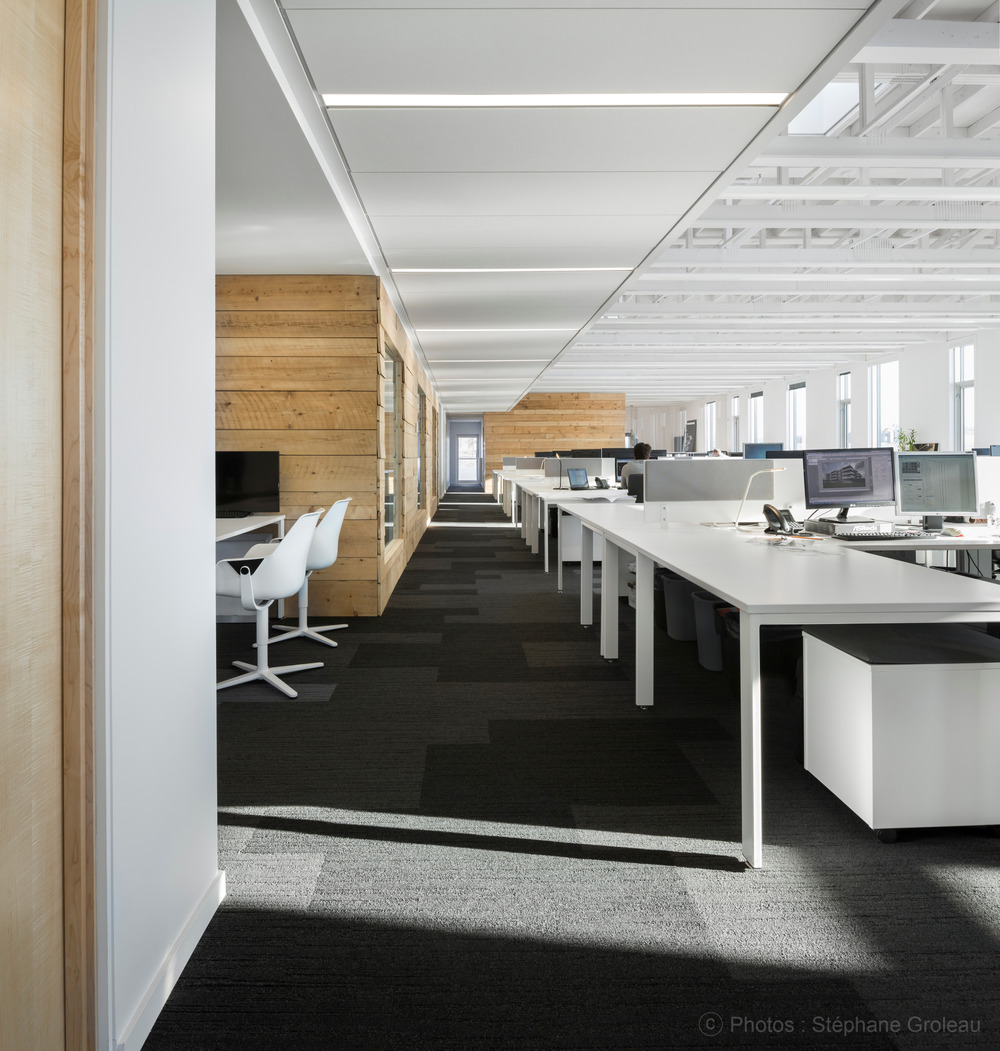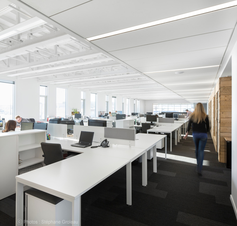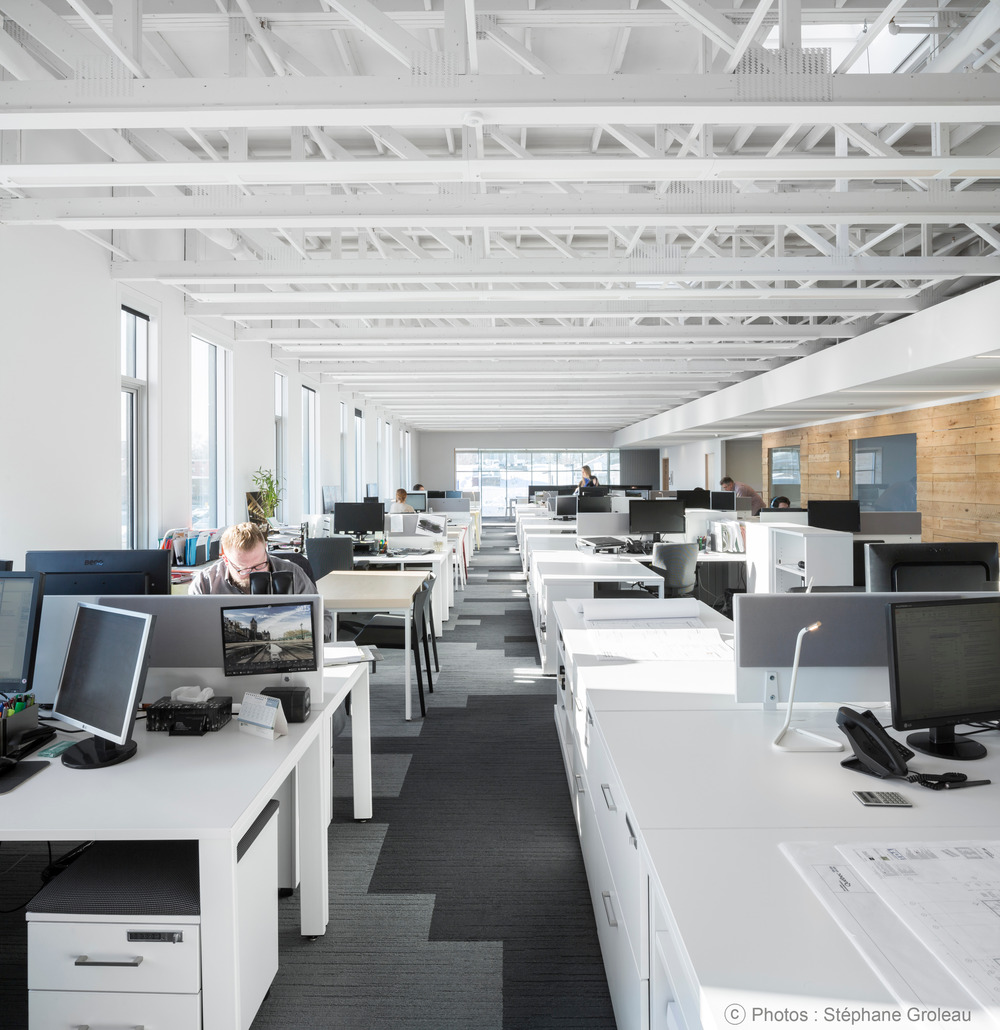 The building’s location has its benefits for users. The dense sector is located on the outskirts of the downtown core, near a busy highway, with public transportation and a variety of services. Two parking lots are reserved for carpoolers and a charging station for electric cars is at the disposal of employees. The south facing terrace serves as a much appreciated rest area with landscaping featuring maintenance free and eatable plantings. Most of the plants are hardy and eatable, such as raspberry, lilies and serviceberry, don’t require irrigation and enable occupants as well as clients to use the outdoor areas of their environment. The building offers a stimulating work environment. Natural lighting and outdoor views are elements that are particularly appreciated. Most areas have natural lighting due to abundant windows on the four sides of the building, situated to optimize the different lighting opportunities during the day. Five light wells add midday lighting that is both appealing and varied depending on the time of day. LED fixtures, equipped with light detectors in the two large work areas, complete the indoor lighting needs,. Key objectives, in keeping with the premises of comfort and simplicity, were to provide fresh air and to control the immediate environment. A series of windows vents are strategically positioned around the building envelope. In addition, the mechanical systems are designed to efficiently cool and heat the different zones of the building at the same time.
